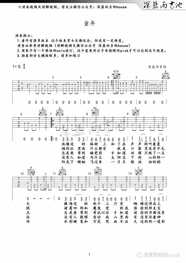吉他罗大佑《童年》吉他谱_吉他弹唱谱_深蓝雨吉他编配