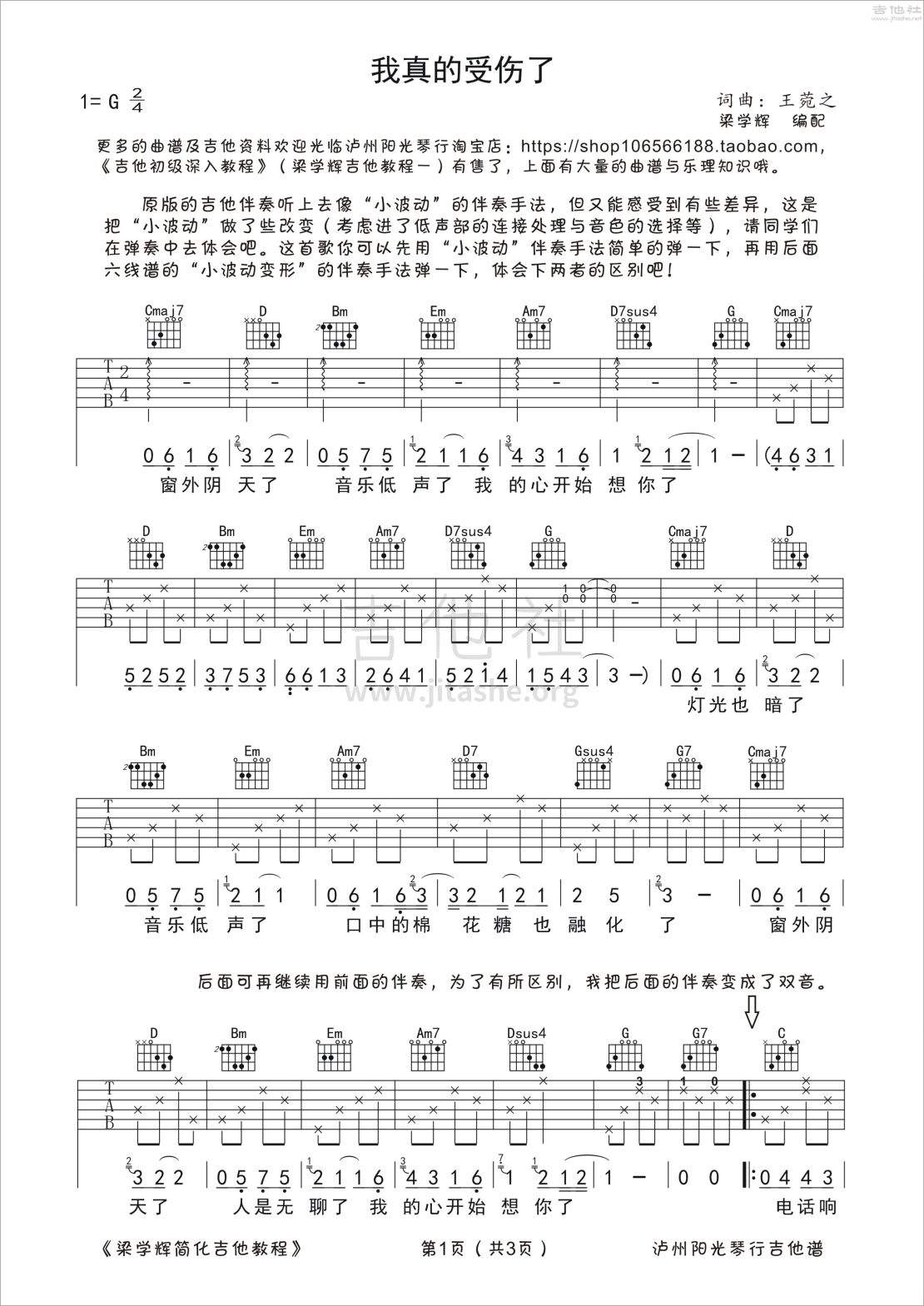 张学友/王菀之《我真的受伤了》吉他谱,梁学辉编配出品,共有3张高清图谱。...