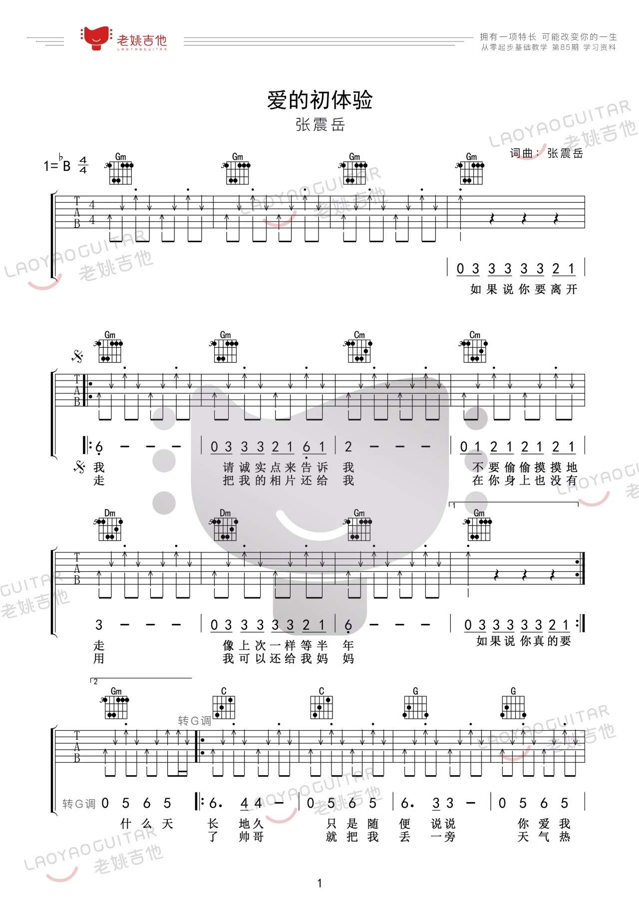 张震岳《爱的初体验》吉他谱,老姚吉他编配出品,共有3张高清图谱。...