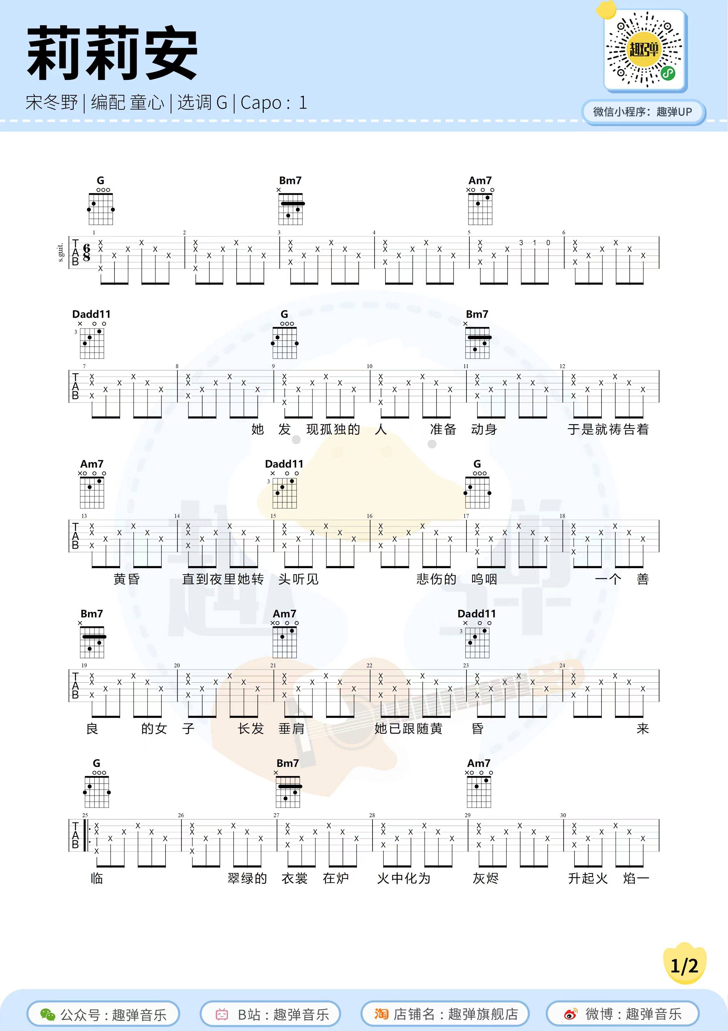 宋冬野《莉莉安》吉他谱,共有2张高清图谱,免翻页排版设计。...