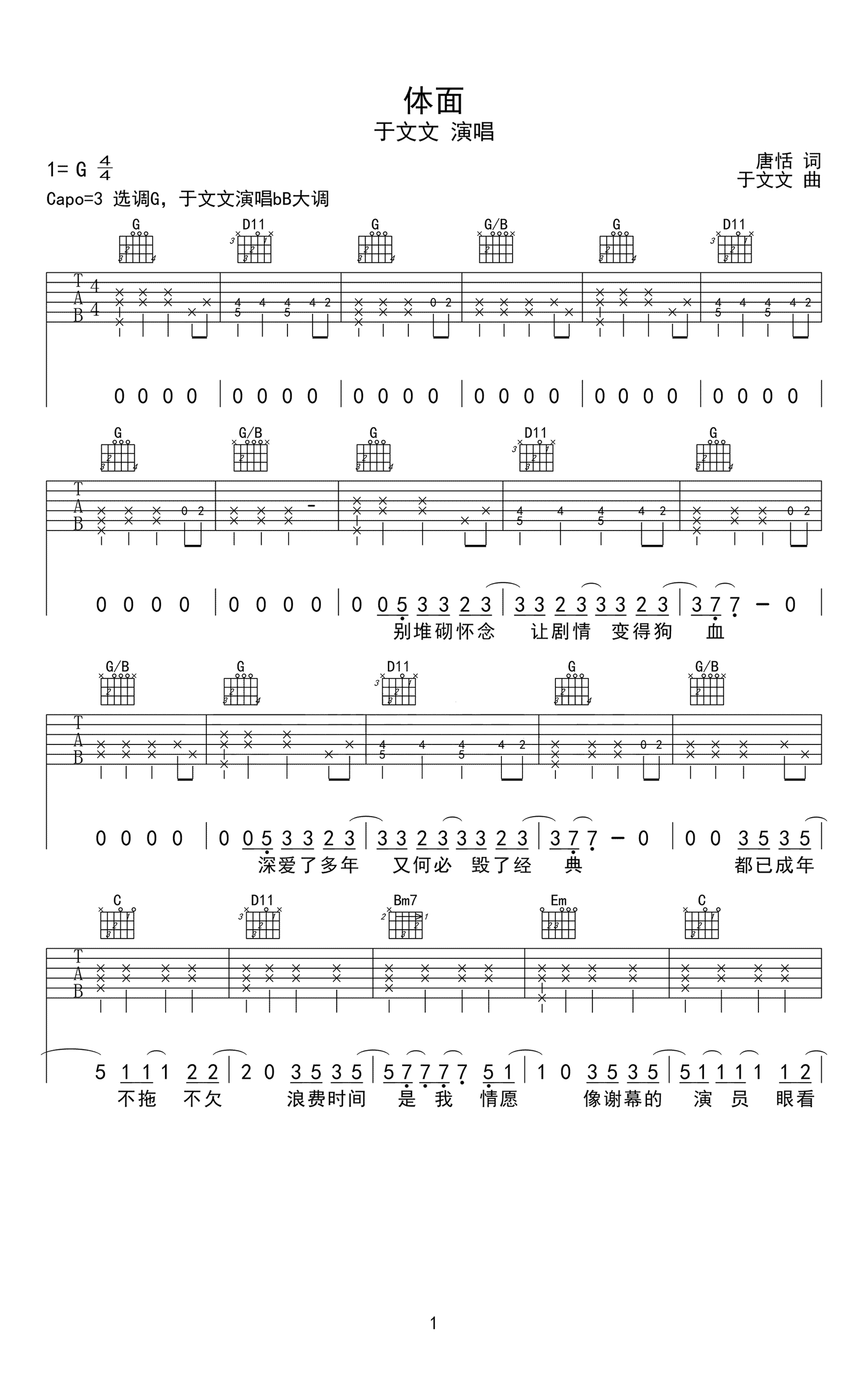 吉他于文文《体面》吉他谱_吉他弹唱谱