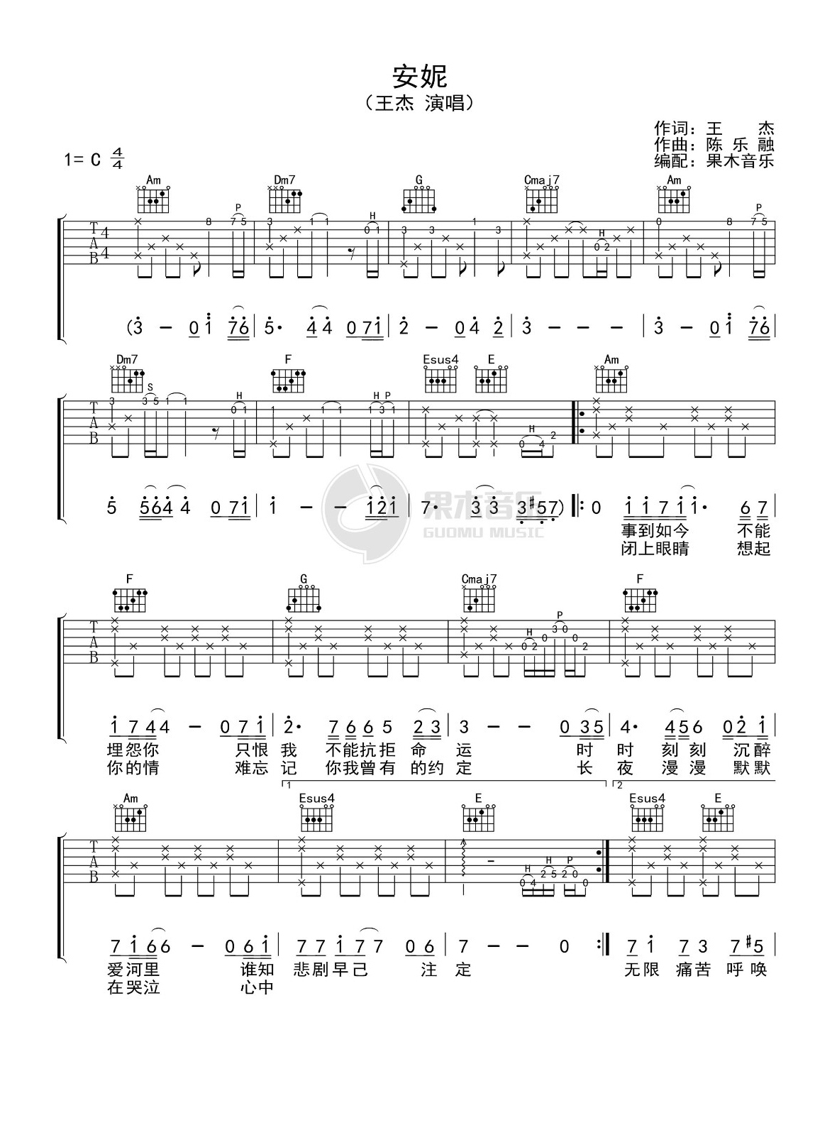 吉他王杰《安妮》吉他谱_吉他弹唱谱_果木音乐编配