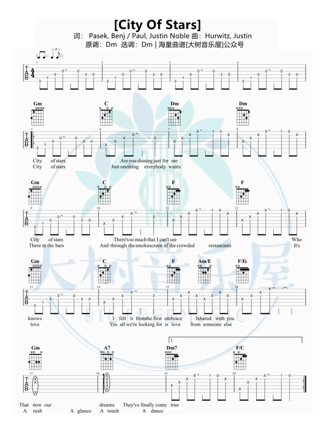 吉他Ryan Gosling《City of stars》吉他谱_吉他弹唱谱_大树音乐屋编配