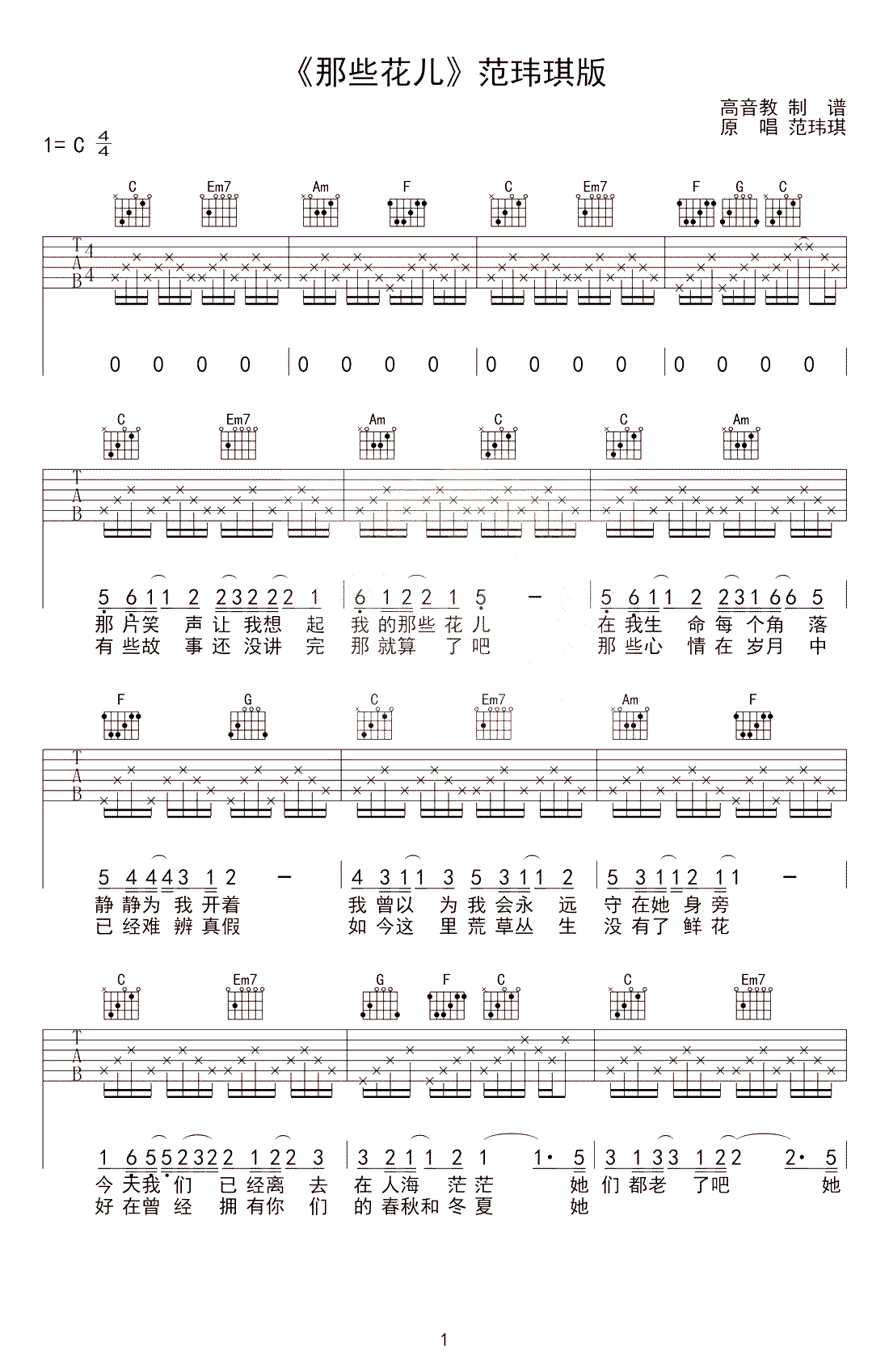 吉他范玮琪《那些花儿》吉他谱_吉他弹唱谱_高音教编配