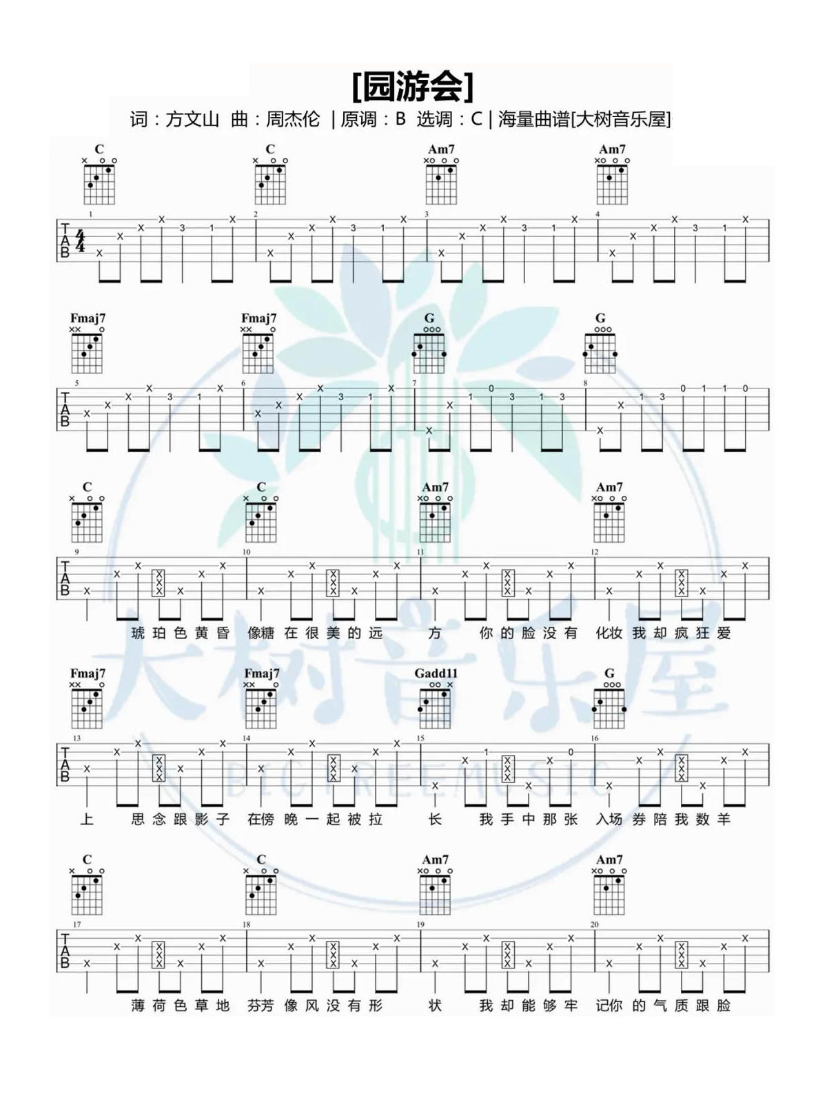 吉他周杰伦《园游会》吉他谱_吉他弹唱谱_大树音乐屋编配
