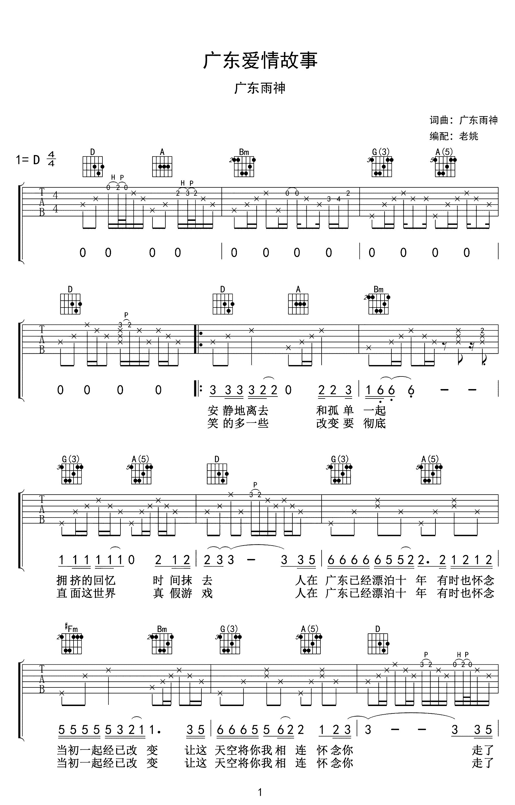 吉他广东雨神《广东爱情故事》吉他谱_吉他弹唱谱_老姚吉他编配
