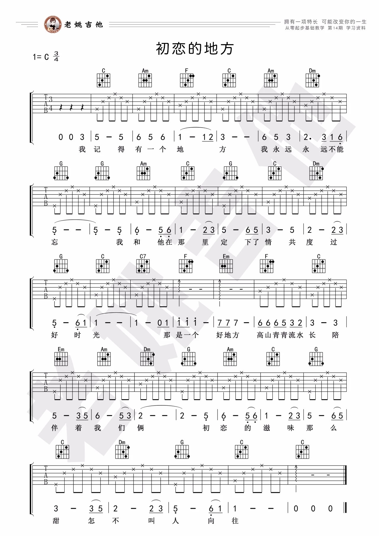 吉他王菲《初恋的地方》吉他谱_吉他弹唱谱_老姚吉他编配