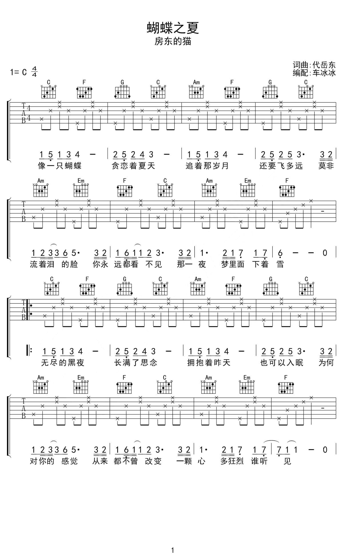 吉他房东的猫《蝴蝶之夏》吉他谱_吉他弹唱谱_无限延音编配