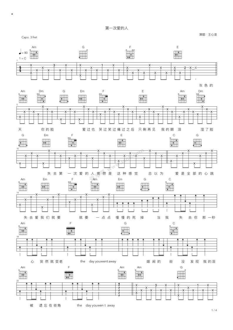 王心凌《第一次爱的人》吉他谱,TQB编配出品,共有4张高清图谱。...