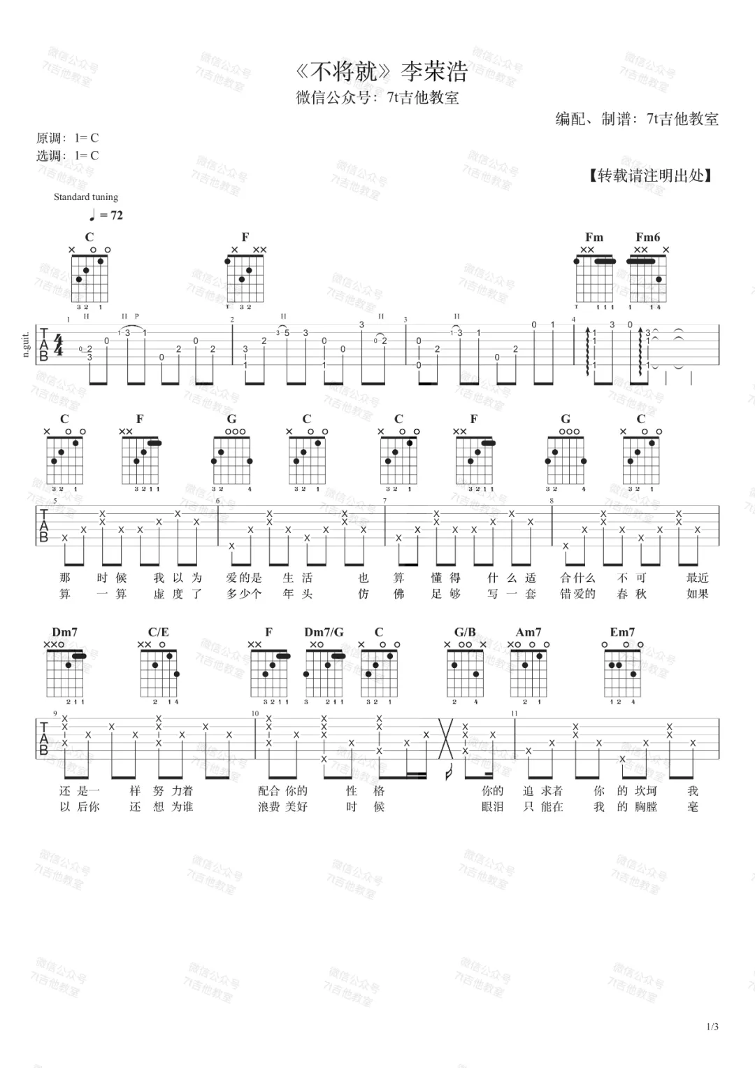李荣浩《不将就》吉他谱,7T吉他教室编配出品,共有3张高清图谱。...
