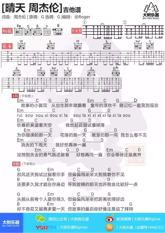 周杰伦《晴天》吉他谱,大树音乐屋编配出品,共有1张高清图谱,免翻页排版设计。...