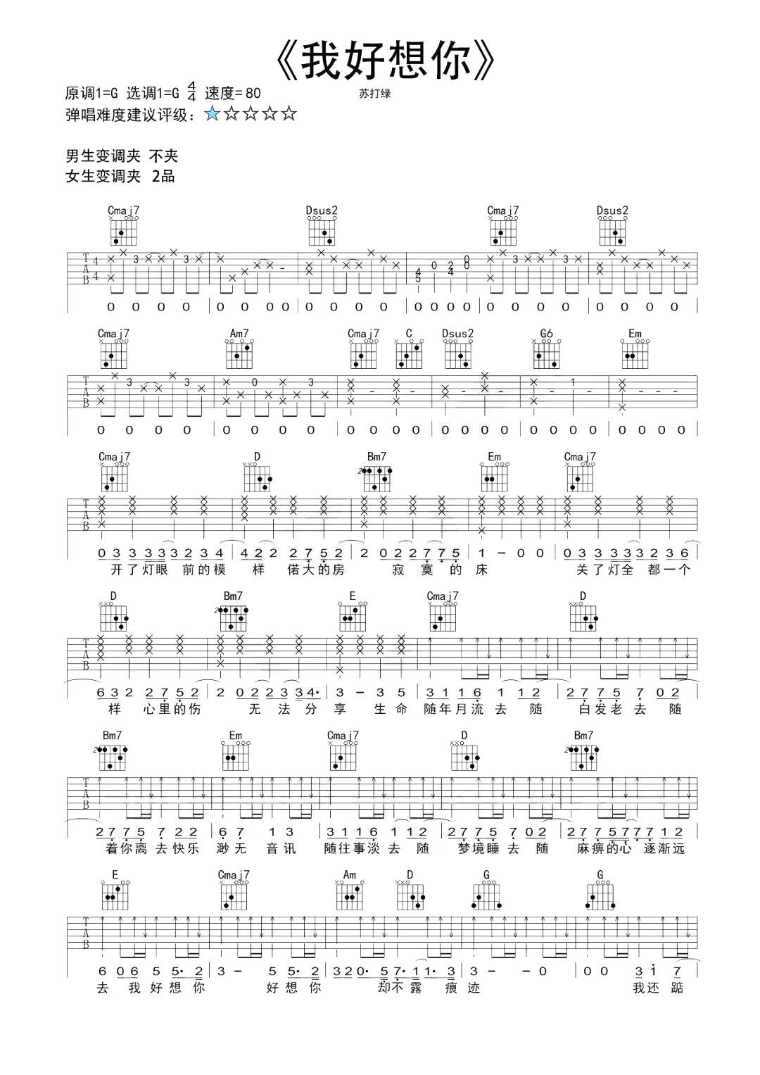 苏打绿《我好想你》吉他谱,孙学长吉他教室编配出品,共有3张高清图谱。...