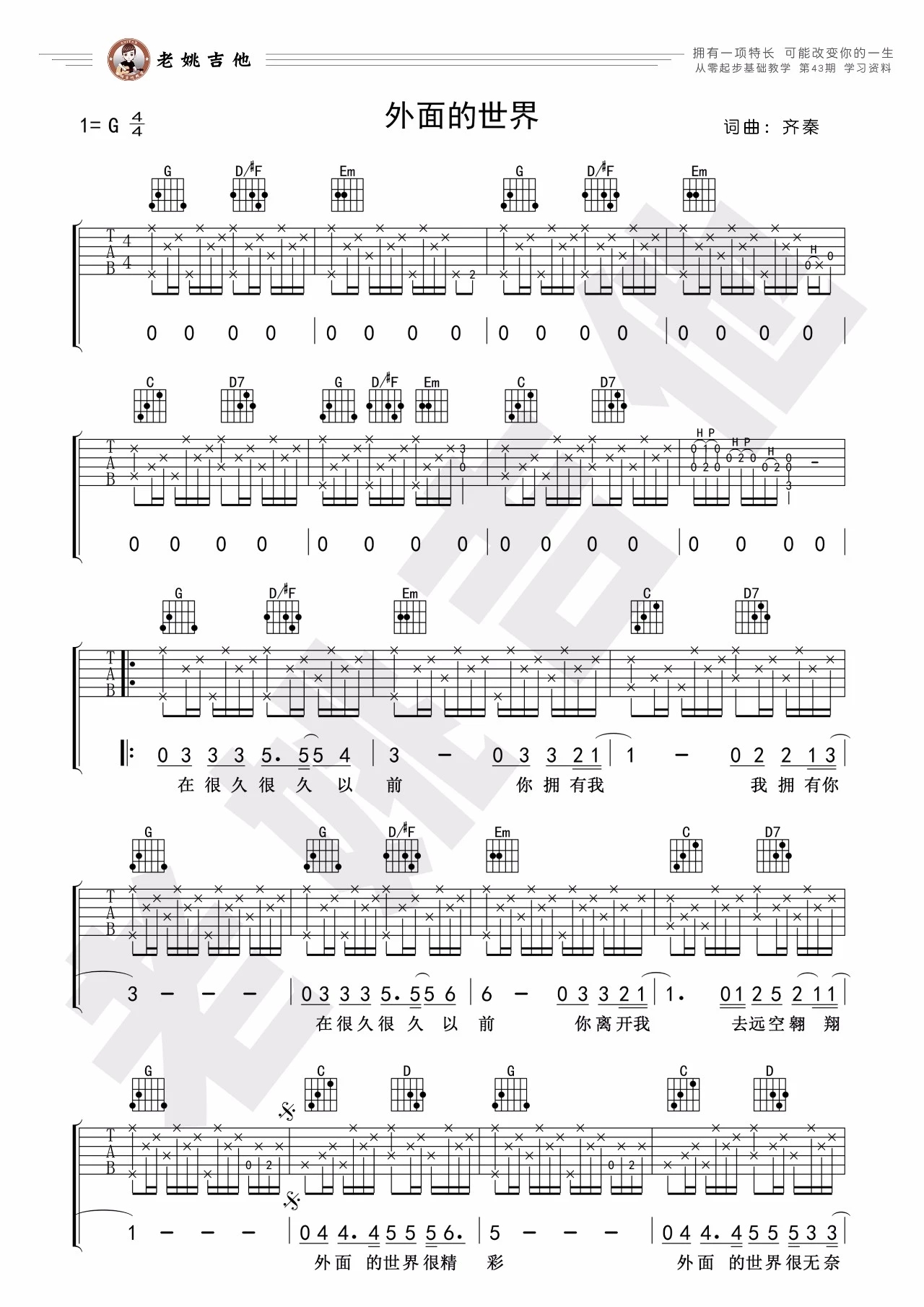 吉他齐秦《外面的世界》吉他谱_吉他弹唱谱_老姚吉他编配