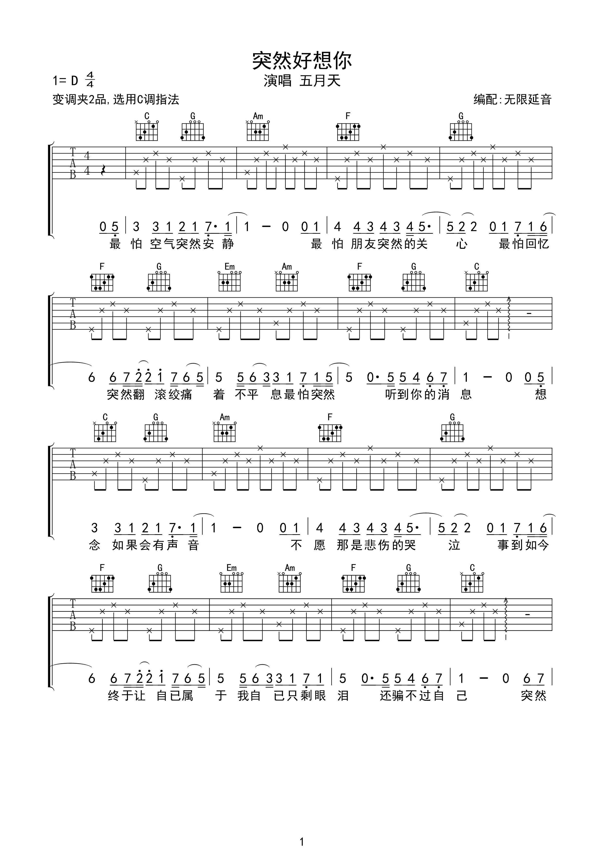 吉他五月天《突然好想你》吉他谱_吉他弹唱谱_无限延音编配