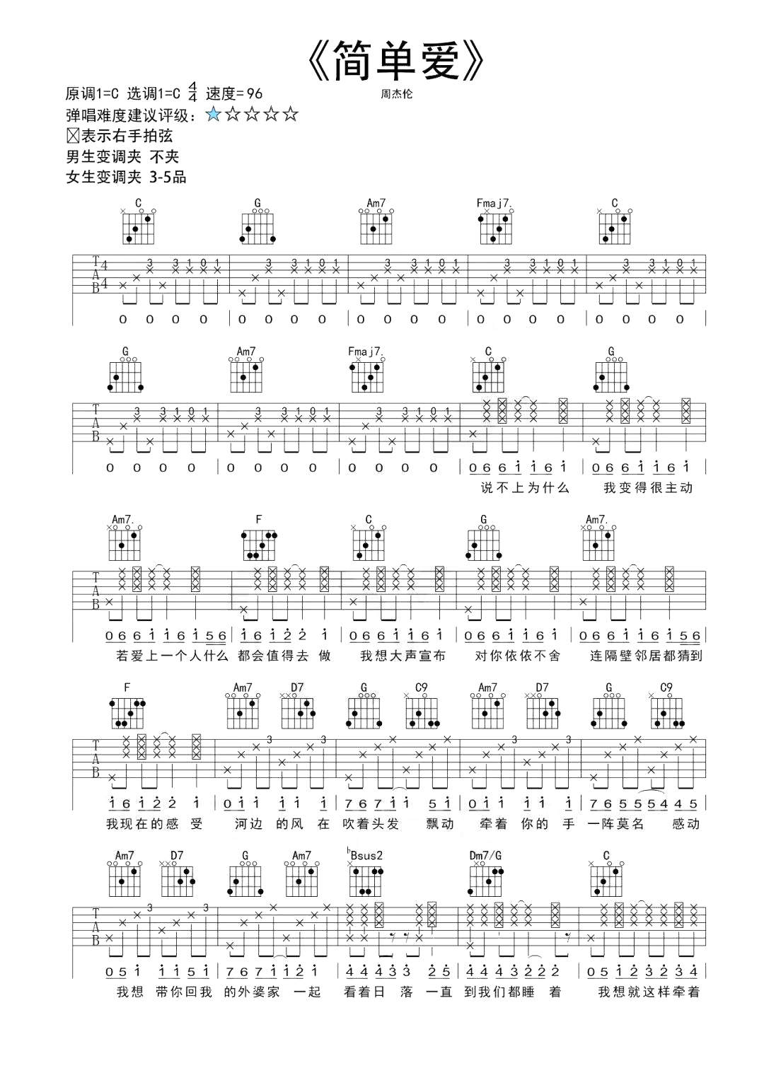 吉他周杰伦《简单爱》吉他谱_吉他弹唱谱_孙学长吉他教室编配
