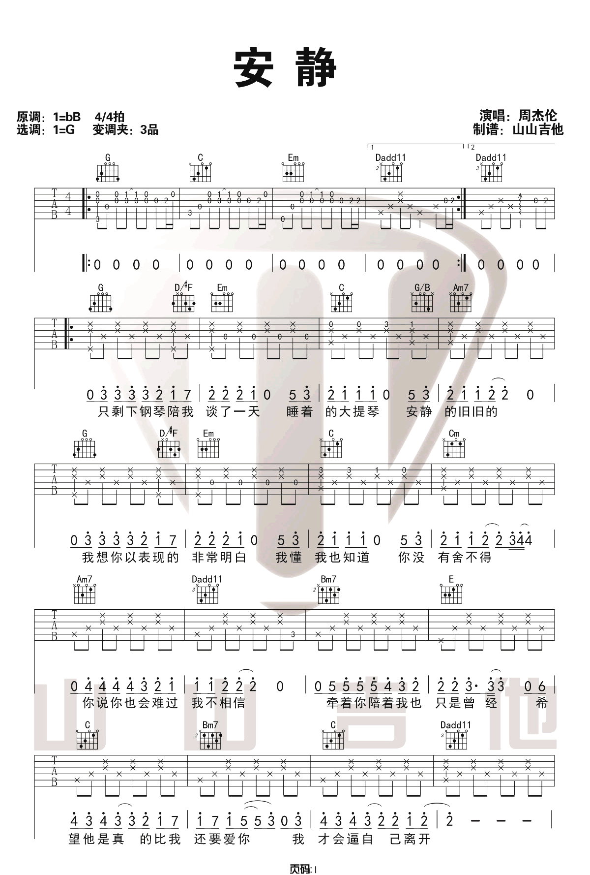 周杰伦《安静》吉他谱,山山吉他编配出品,共有3张高清图谱。...