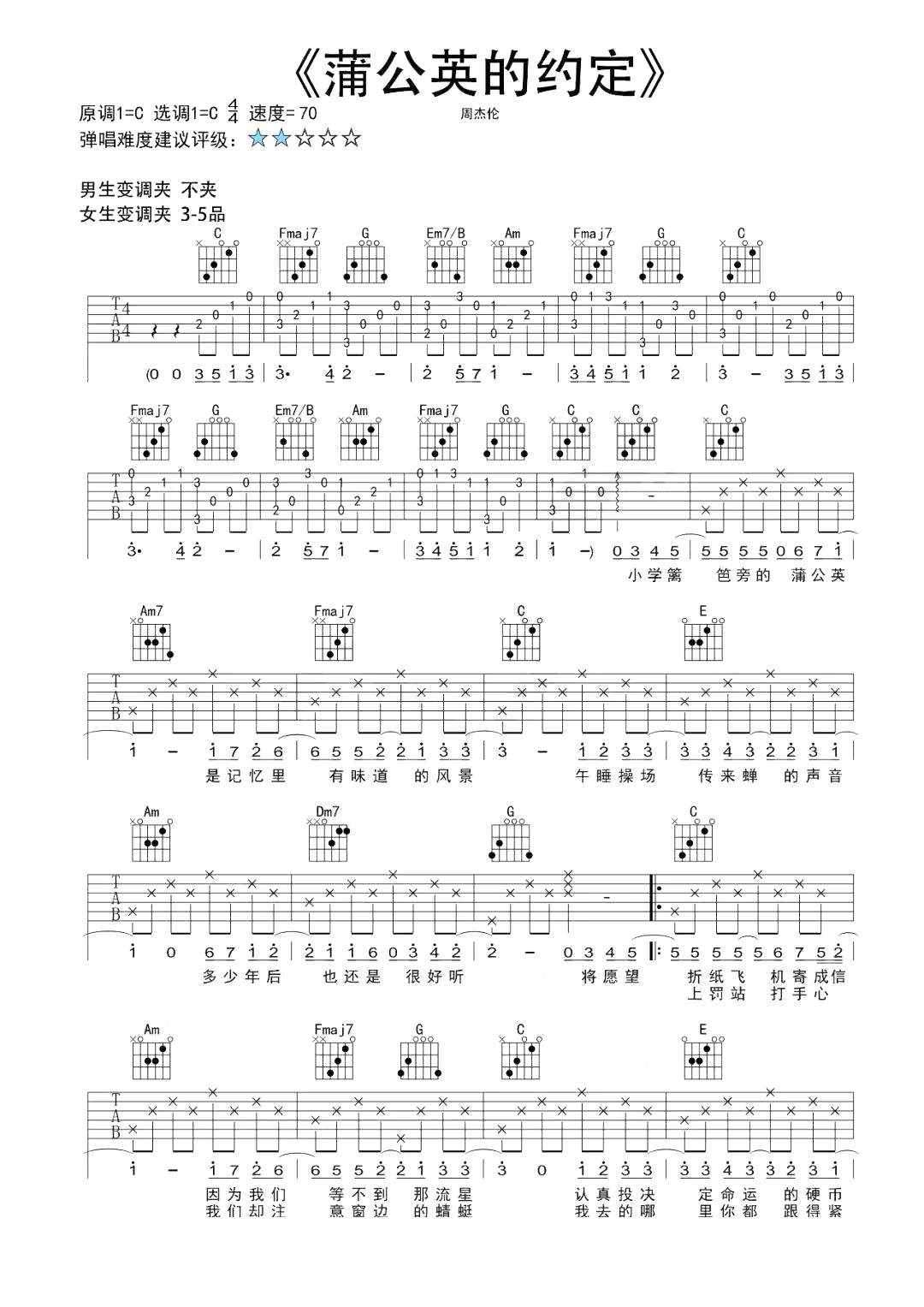 吉他周杰伦《蒲公英的约定》吉他谱_吉他弹唱谱_孙学长吉他教室编配