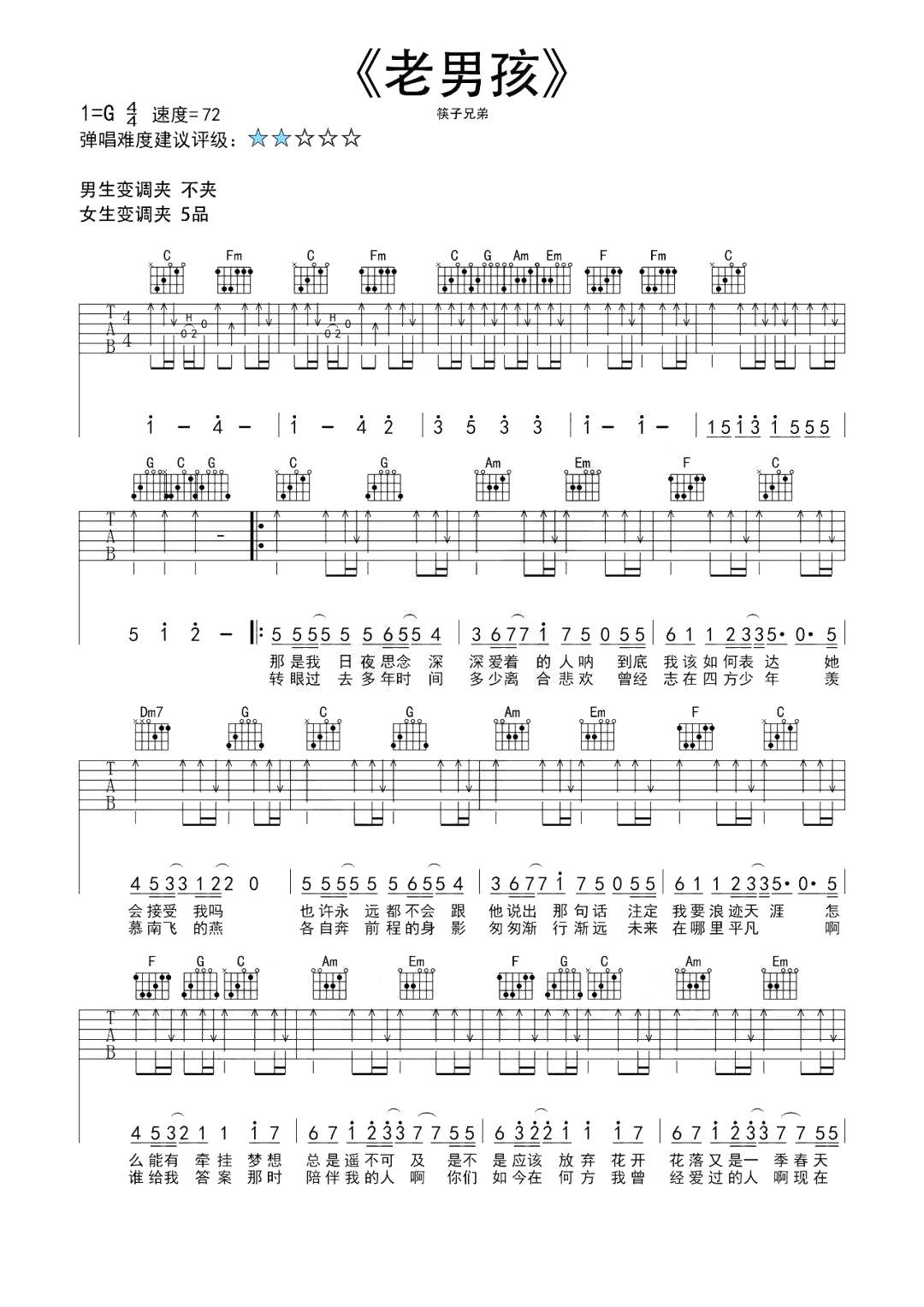 筷子兄弟《老男孩》吉他谱,孙学长吉他教室编配出品,共有3张高清图谱。...