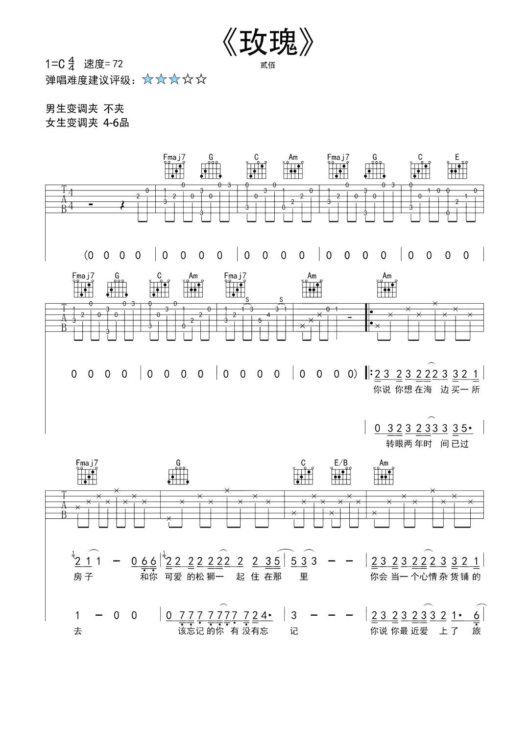 贰佰《玫瑰》吉他谱,孙学长吉他教室编配出品,共有3张高清图谱。...
