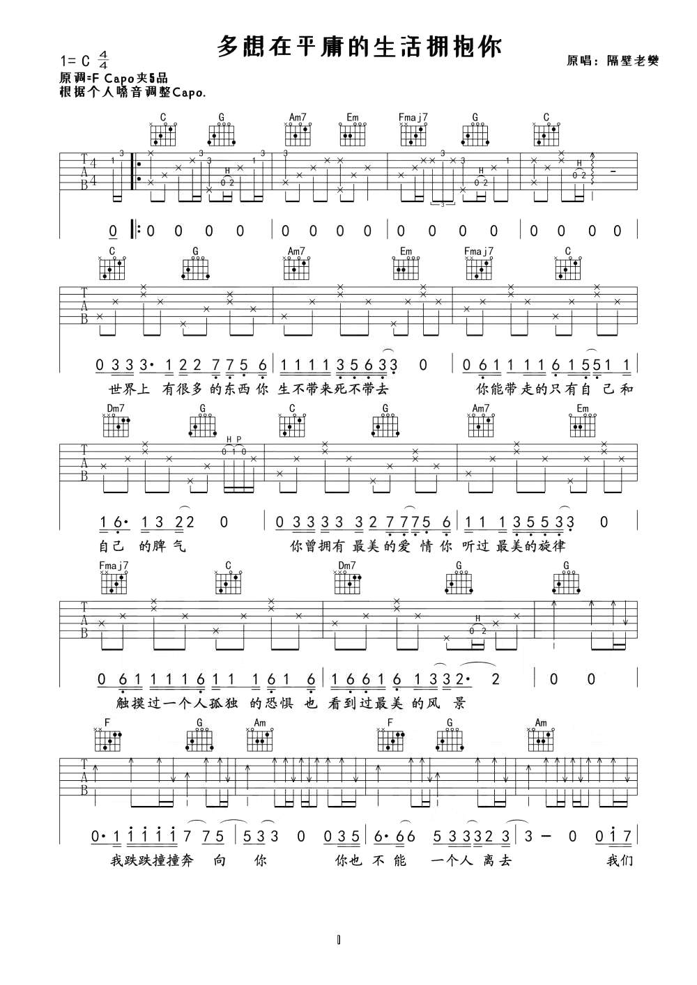 徐佳豪/隔壁老樊《多想在平庸的生活拥抱你》吉他谱,共有2张高清图谱,免翻页排版设计。...