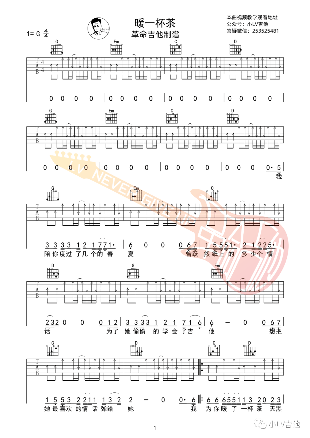 邵帅《暖一杯茶》吉他谱,革命吉他编配出品,共有3张高清图谱。...
