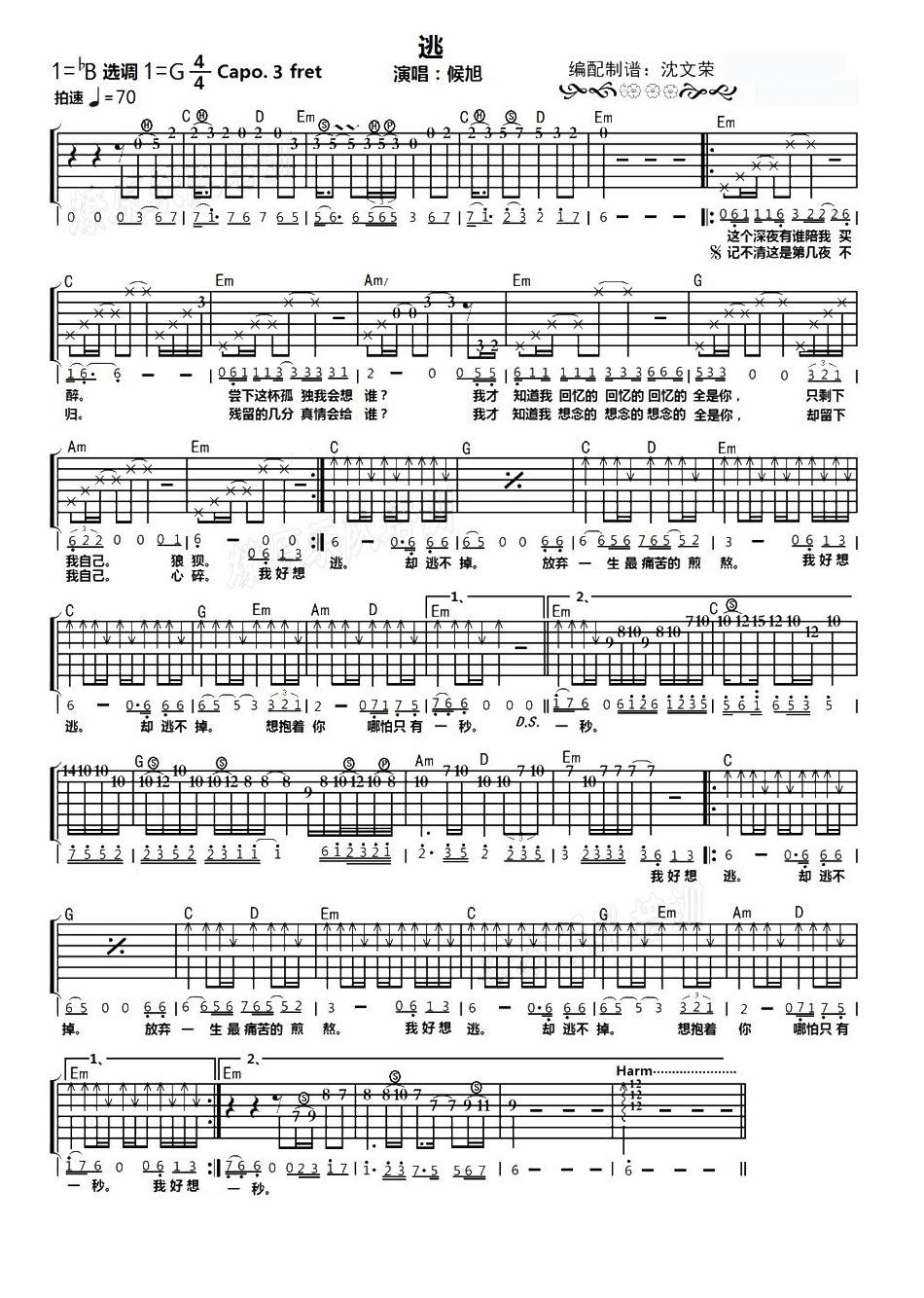 逃吉他谱_侯旭,本曲谱采用G调,夹三品位置,歌曲的速度为70bpm....