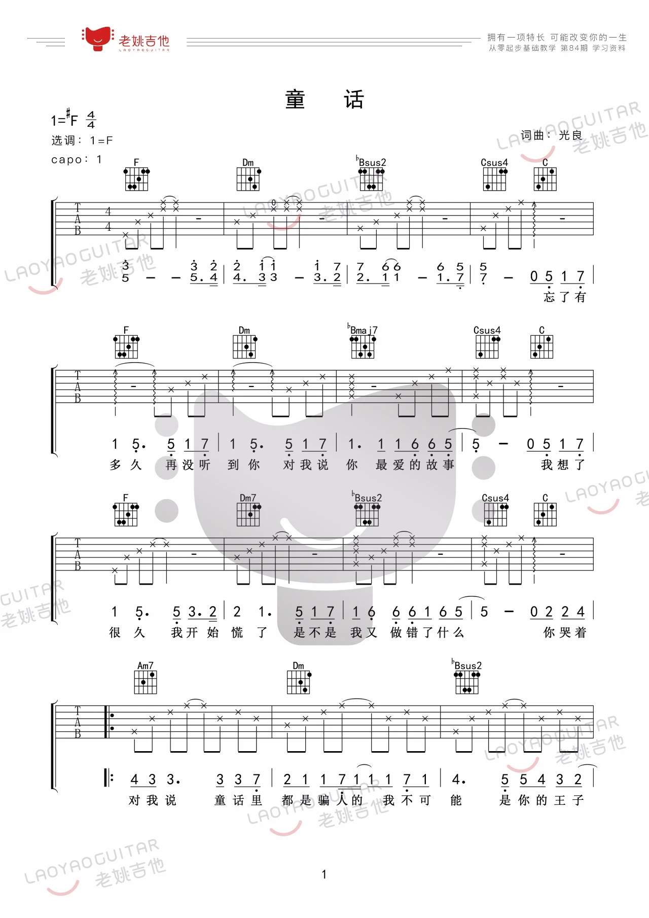 吉他光良《童话》吉他谱_吉他弹唱谱_老姚吉他编配