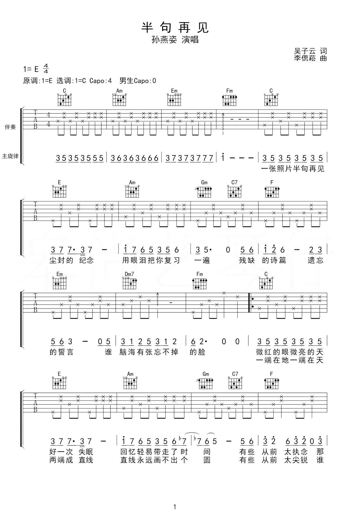 吉他孙燕姿《半句再见》吉他谱_吉他弹唱谱_皋尚艺琴行编配