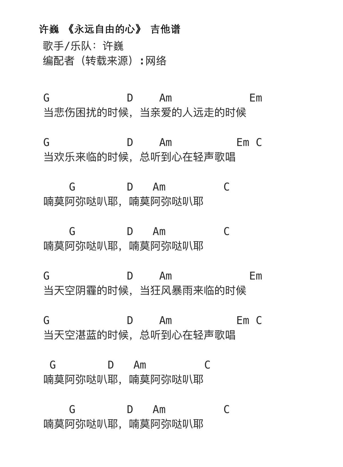 吉他许巍《永远自由的心》吉他谱_吉他弹唱谱