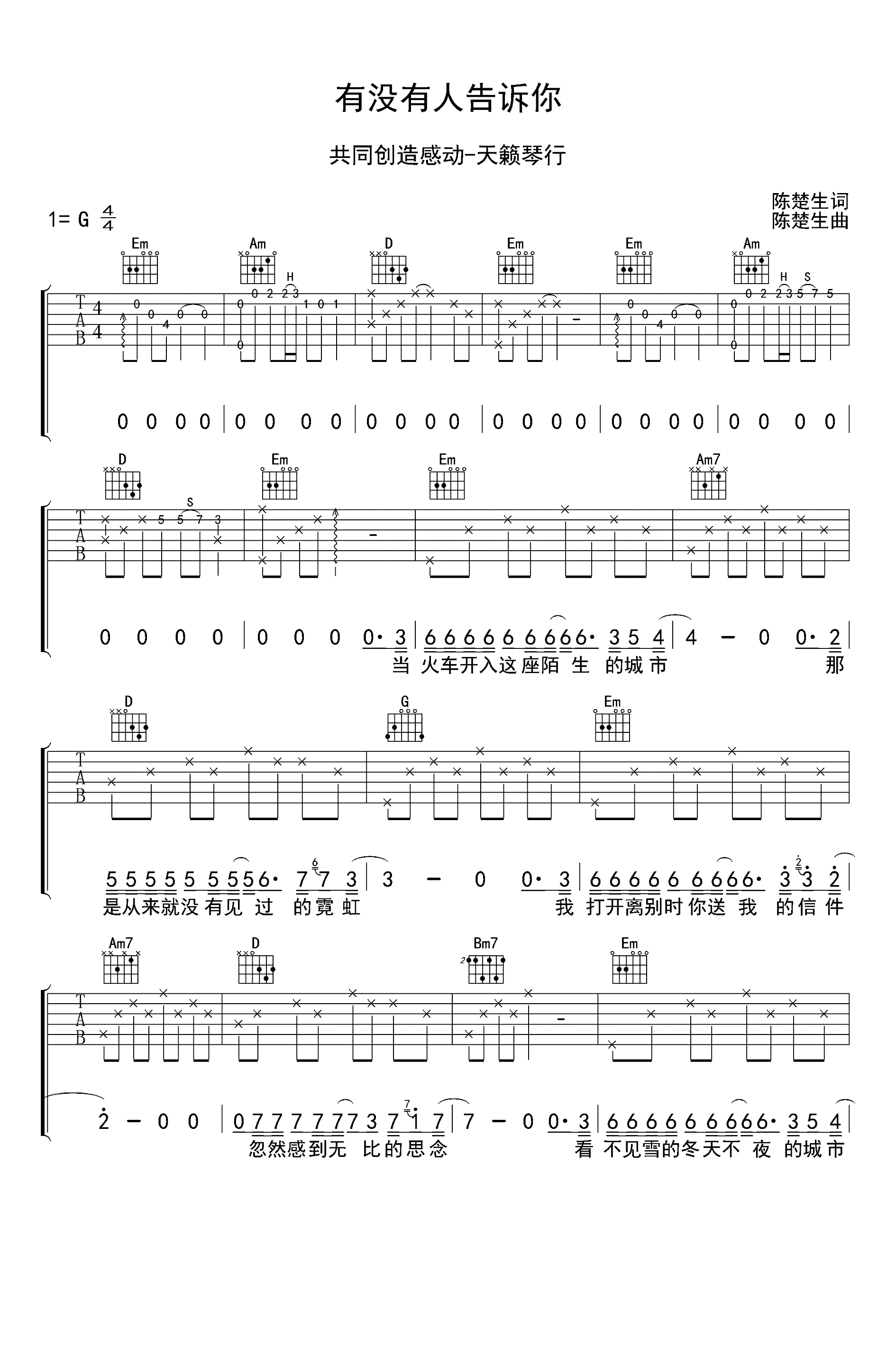 吉他陈楚生《有没有人告诉你》吉他谱_吉他弹唱谱_天籁琴行编配