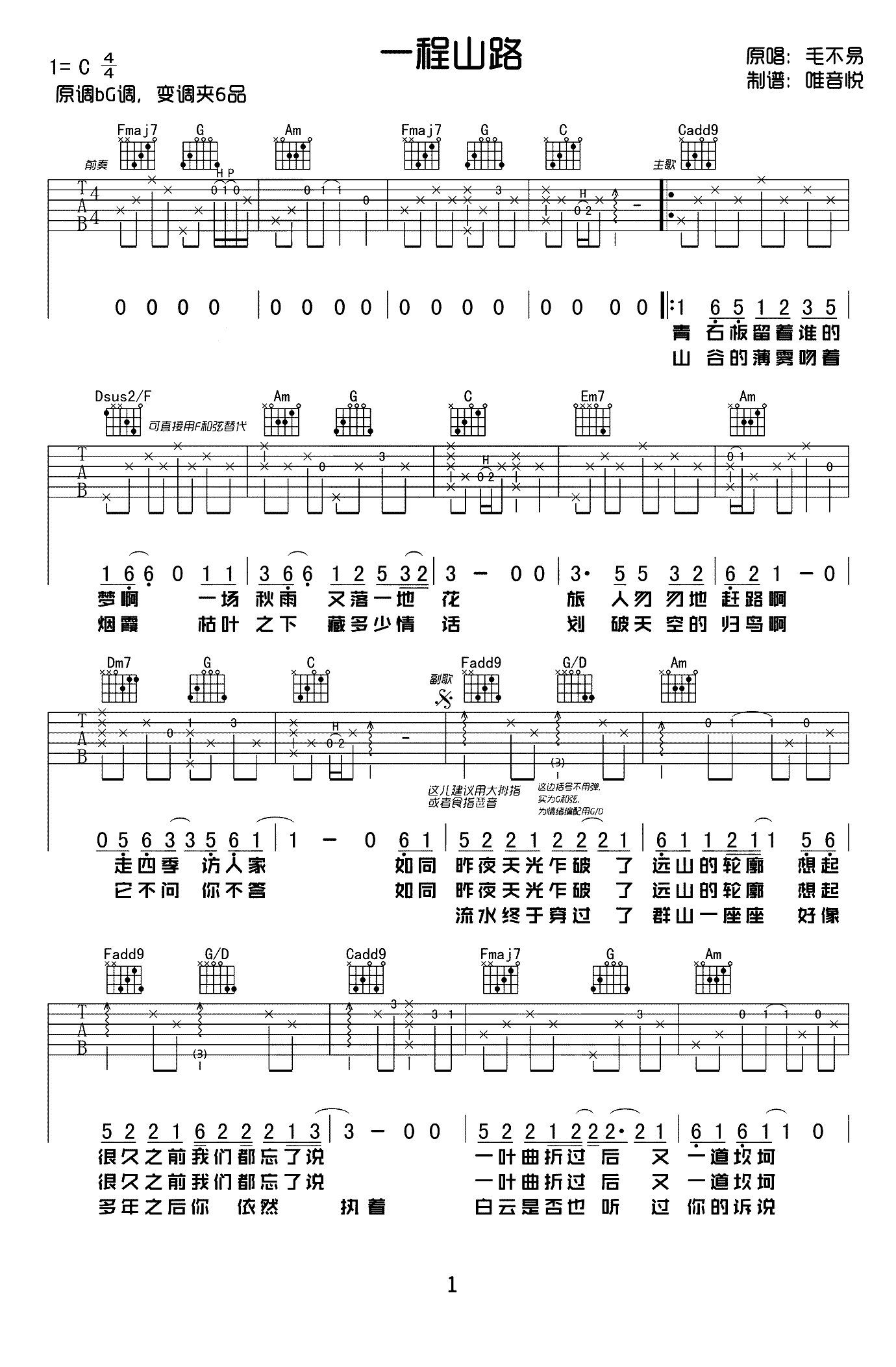 吉他毛不易《一程山路》吉他谱_吉他弹唱谱_唯音悦编配