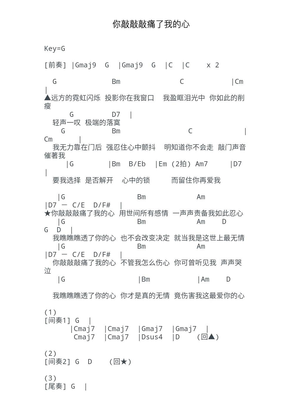 孟庭苇《你敲敲敲痛了我的心》吉他谱,共有1张高清图谱,免翻页排版设计。...
