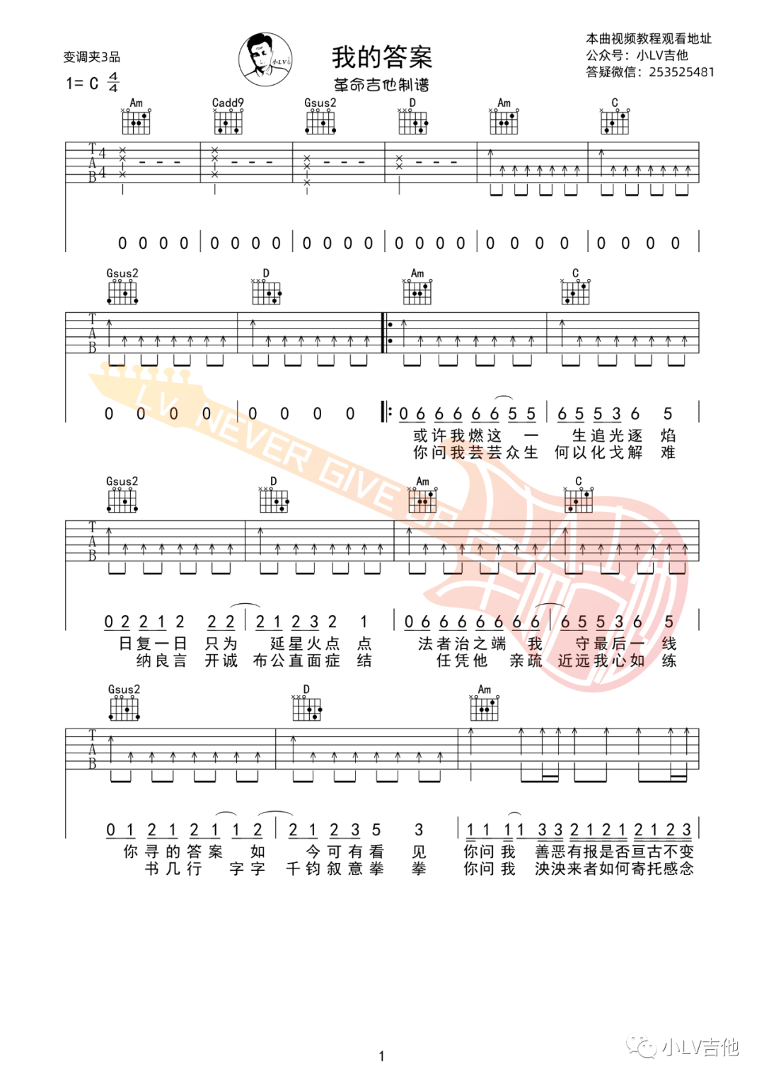 周深《我的答案》吉他谱,革命吉他编配出品,共有3张高清图谱。...