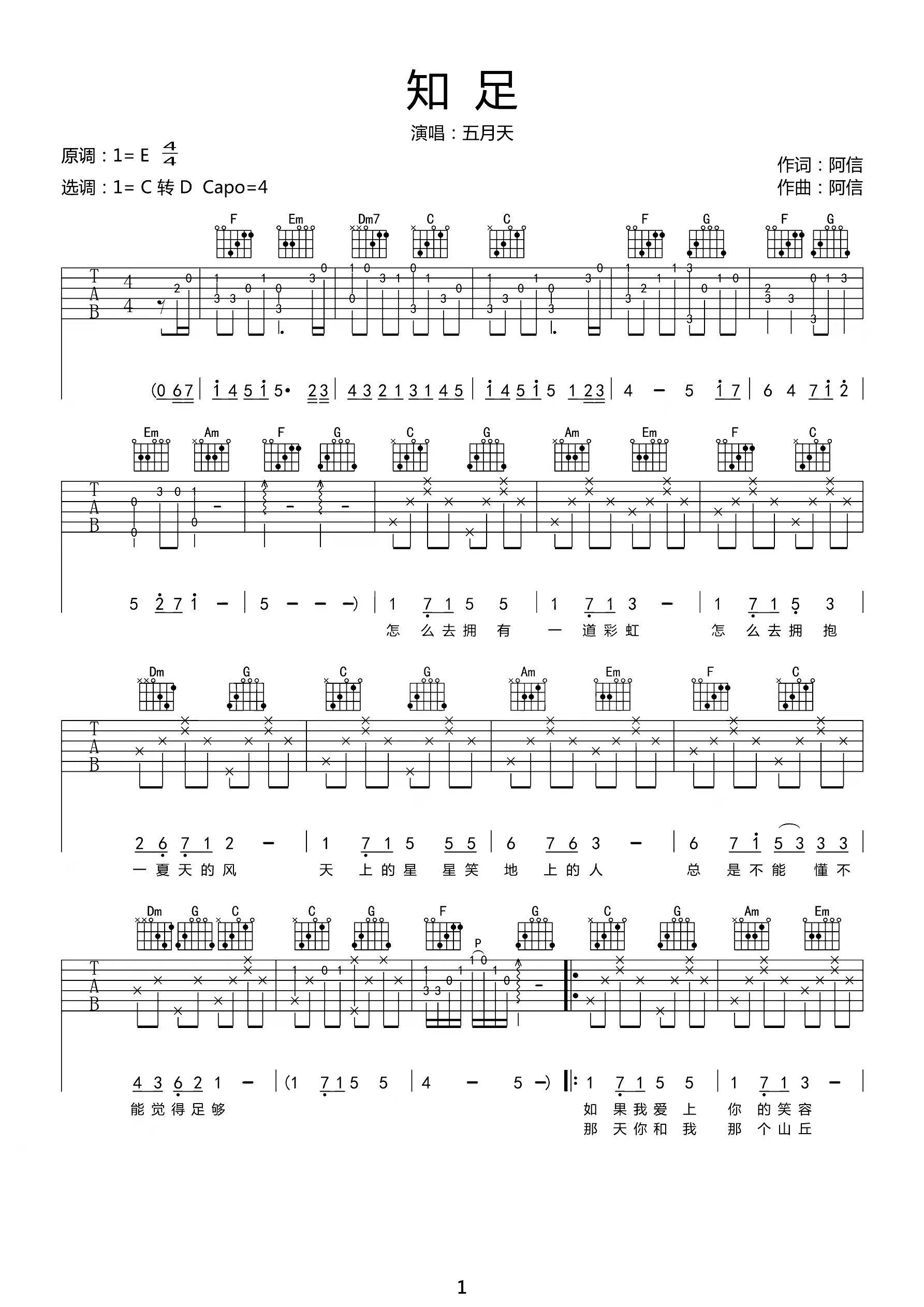 吉他五月天《知足》吉他谱_吉他弹唱谱