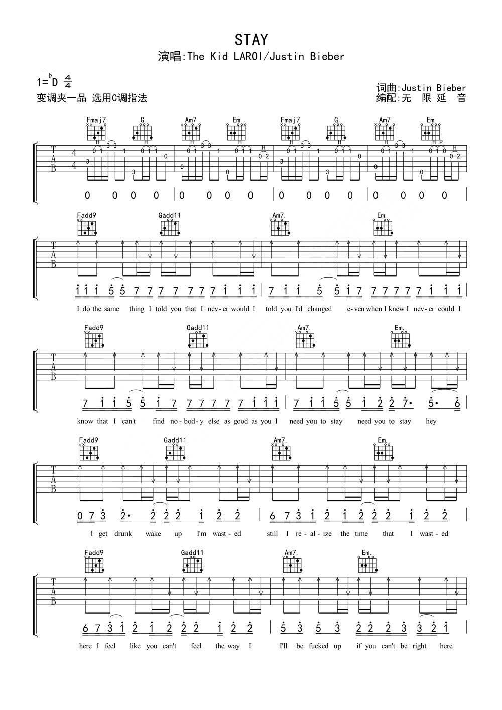 吉他贾斯汀·比伯《Stay》吉他谱_吉他弹唱谱_无限延音编配