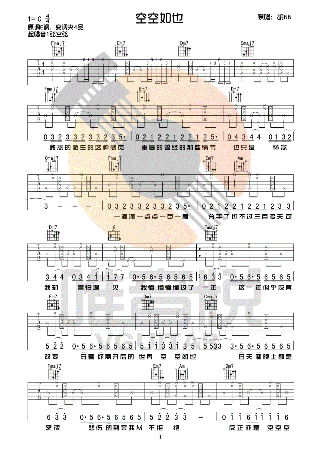 吉他胡66《空空如也》吉他谱_吉他弹唱谱_唯音悦编配