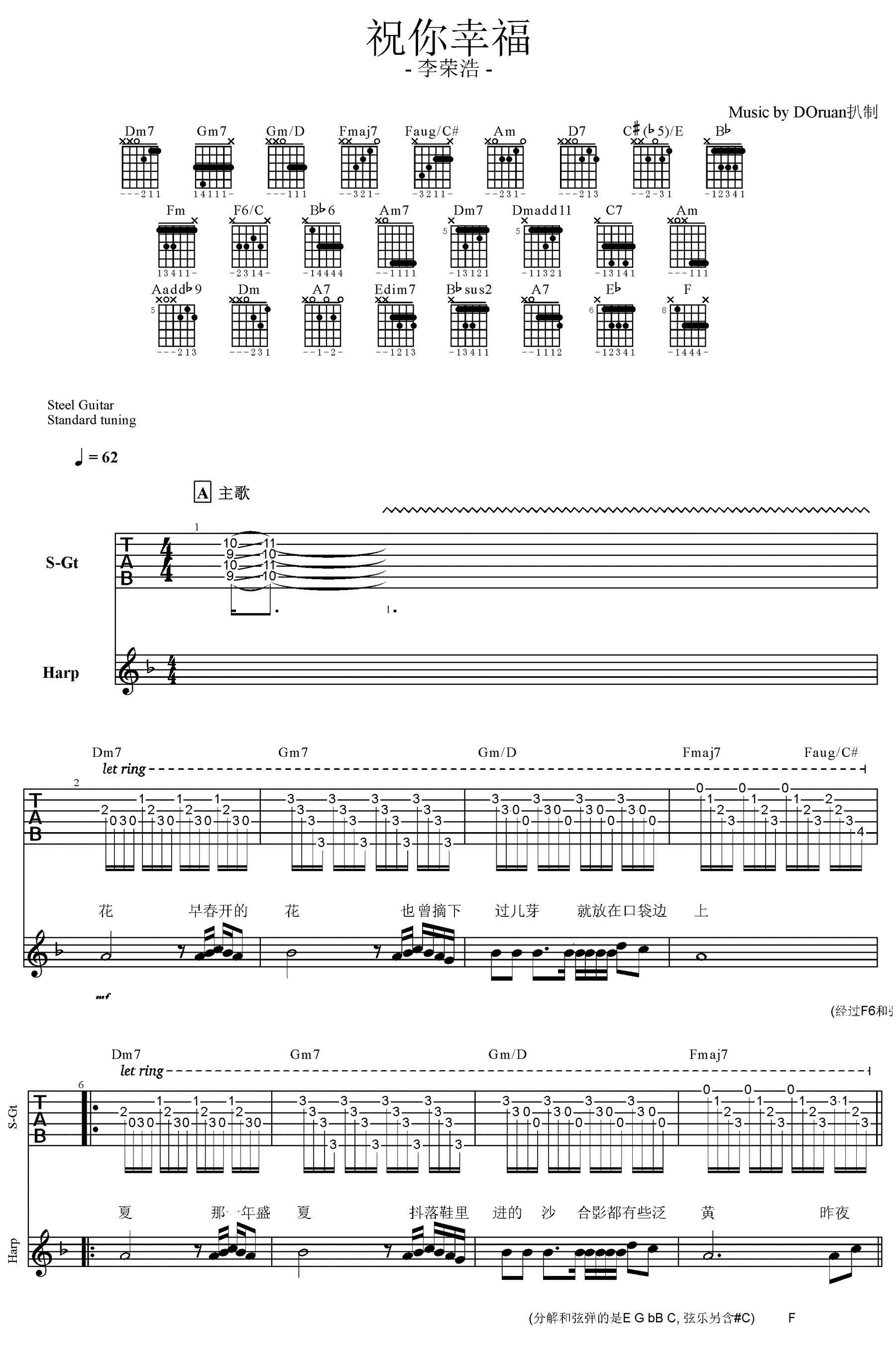 祝你幸福吉他谱,李荣浩第四张音乐专辑里的一首歌曲,关于曲谱的编配,基本按照原版编曲的思路写下来的,有点难弹(其实很难弹),大概就吉他民谣考级教程的8,9级曲目难度左右。主歌部分基本是100%还原原版弹法了,要是觉得低音不足,在第一拍可以补弹个低音进去(已经标明所用的和弦了)...