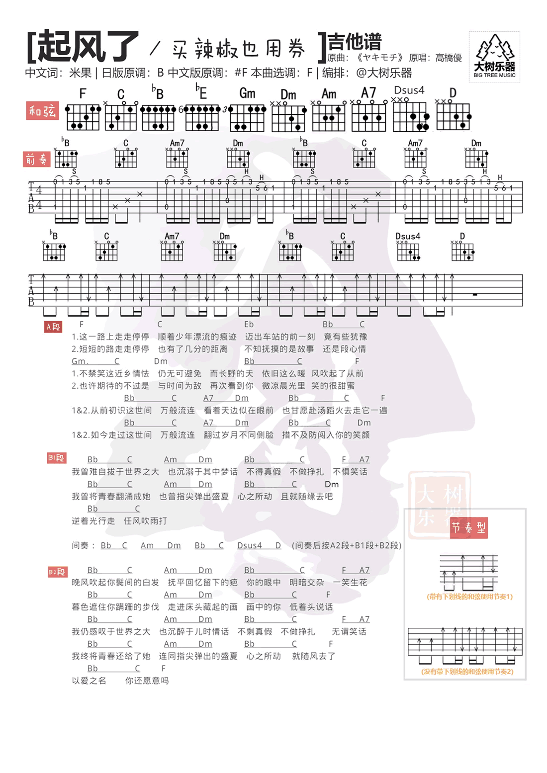 吉他买辣椒也用券《起风了》吉他谱_吉他弹唱谱_大树乐器编配
