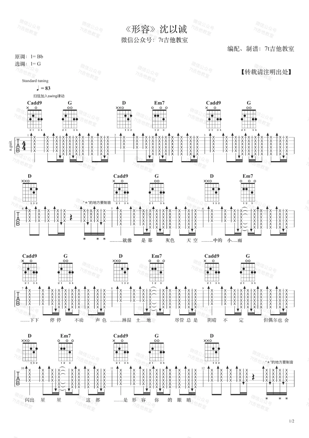 沈以诚《形容》吉他谱,7t音乐教室编配出品,共有2张高清图谱,免翻页排版设计。...