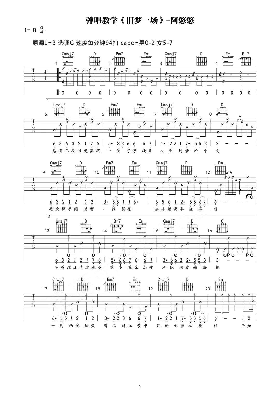阿悠悠《旧梦一场》吉他谱,深蓝雨吉他编配出品,共有2张高清图谱,免翻页排版设计。...