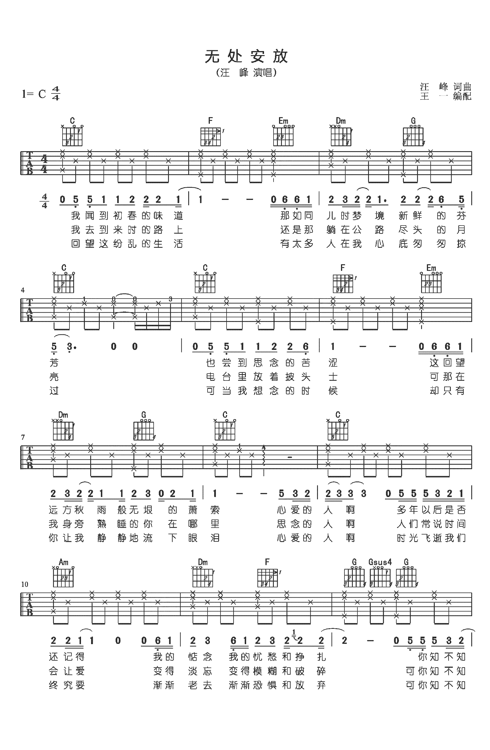 吉他汪峰《无处安放》吉他谱_吉他弹唱谱_王一编配