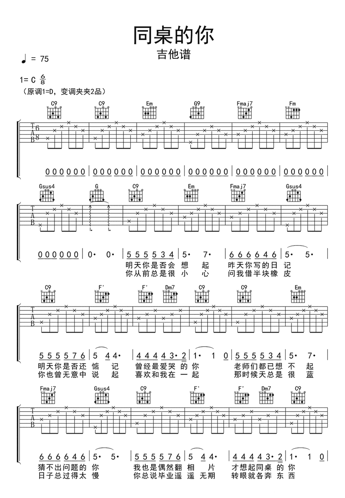 老狼《同桌的你》吉他谱,共有2张高清图谱,免翻页排版设计。...