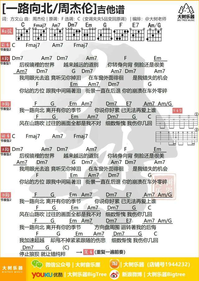 吉他周杰伦《一路向北》吉他谱_吉他弹唱谱_大树音乐屋编配