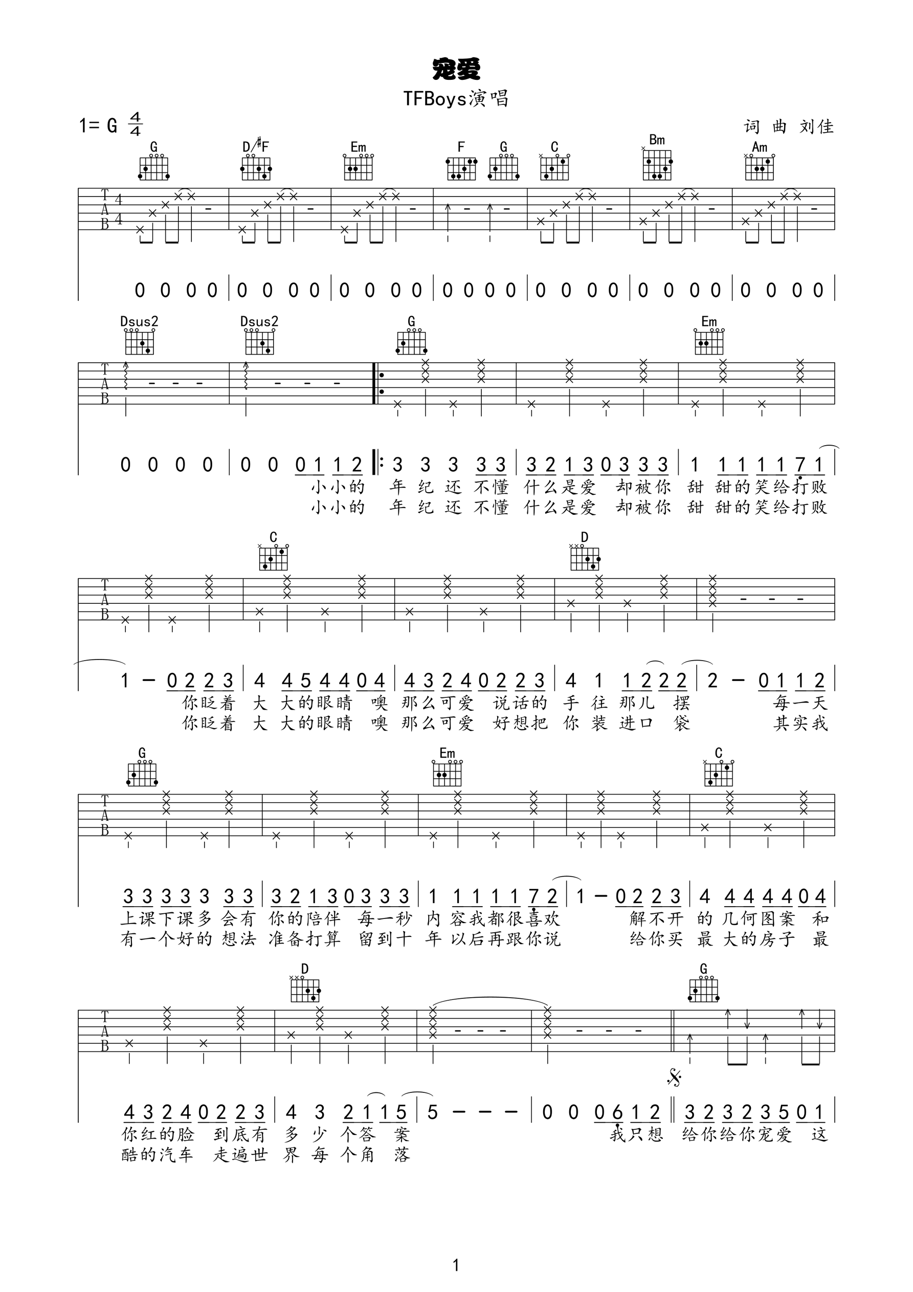 吉他tfboys《宠爱》吉他谱_吉他弹唱谱