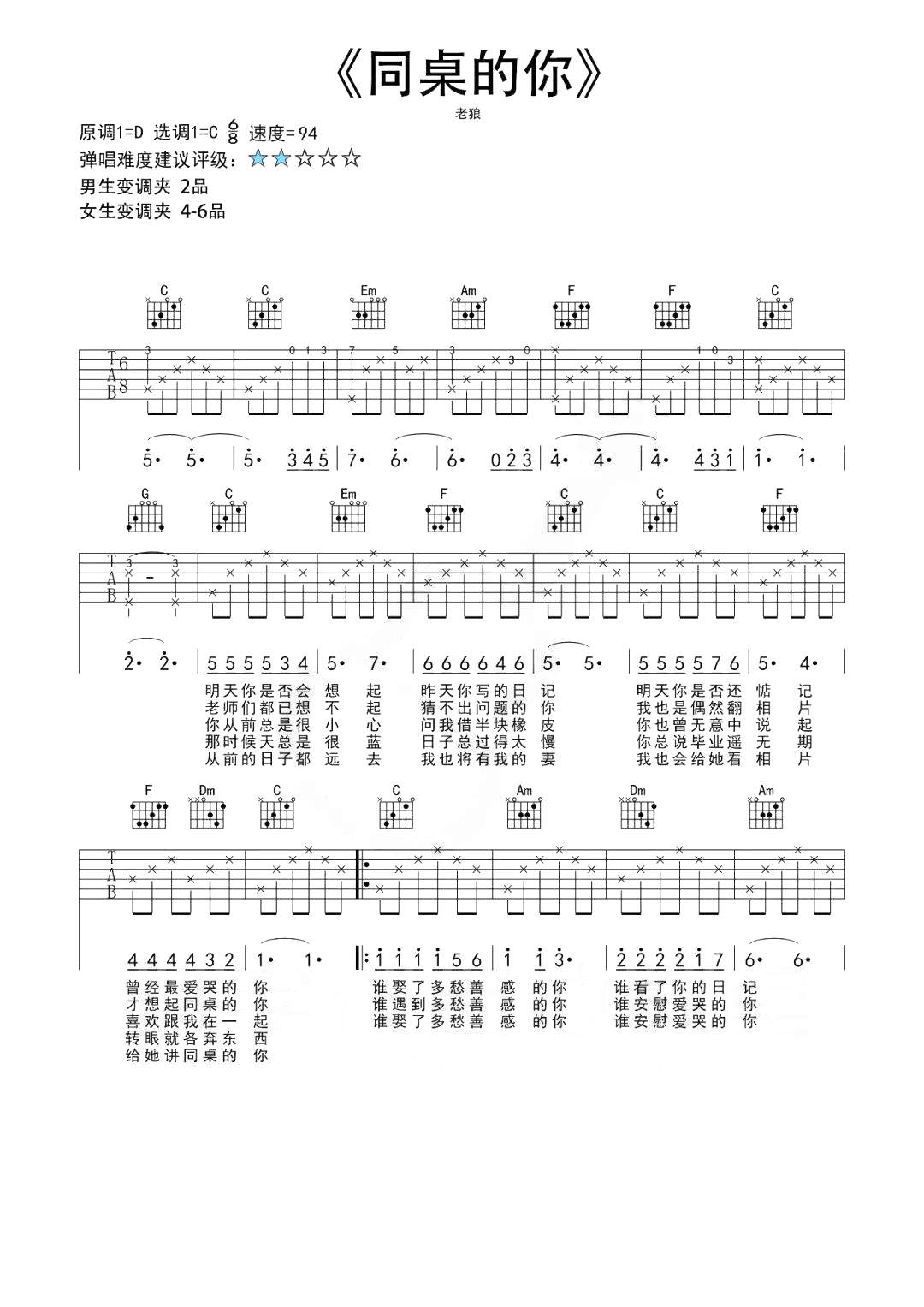 吉他老狼《同桌的你》吉他谱_吉他弹唱谱_孙学长吉他教室编配