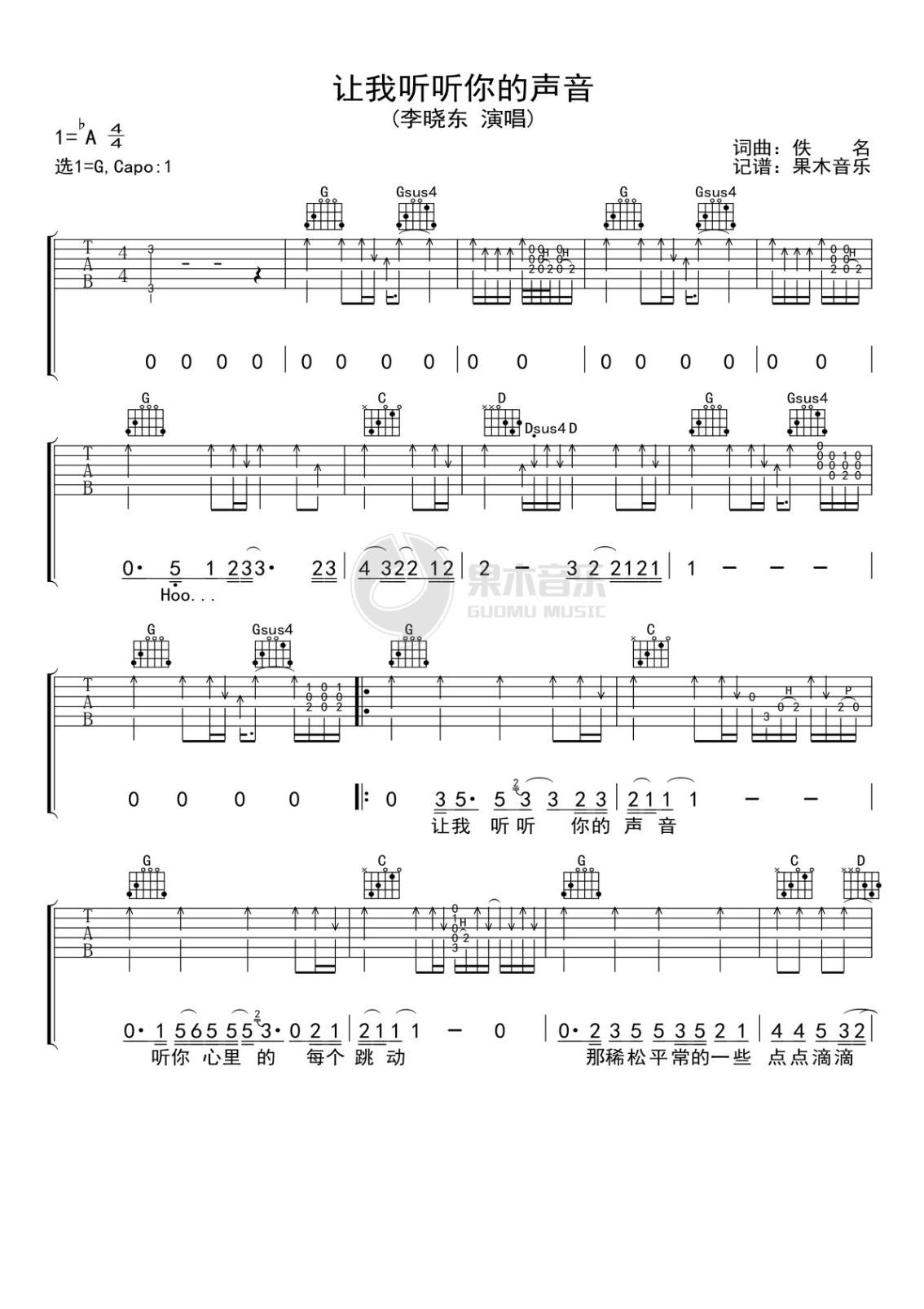 吉他李晓东《让我听听你的声音》吉他谱_吉他弹唱谱_果木音乐编配