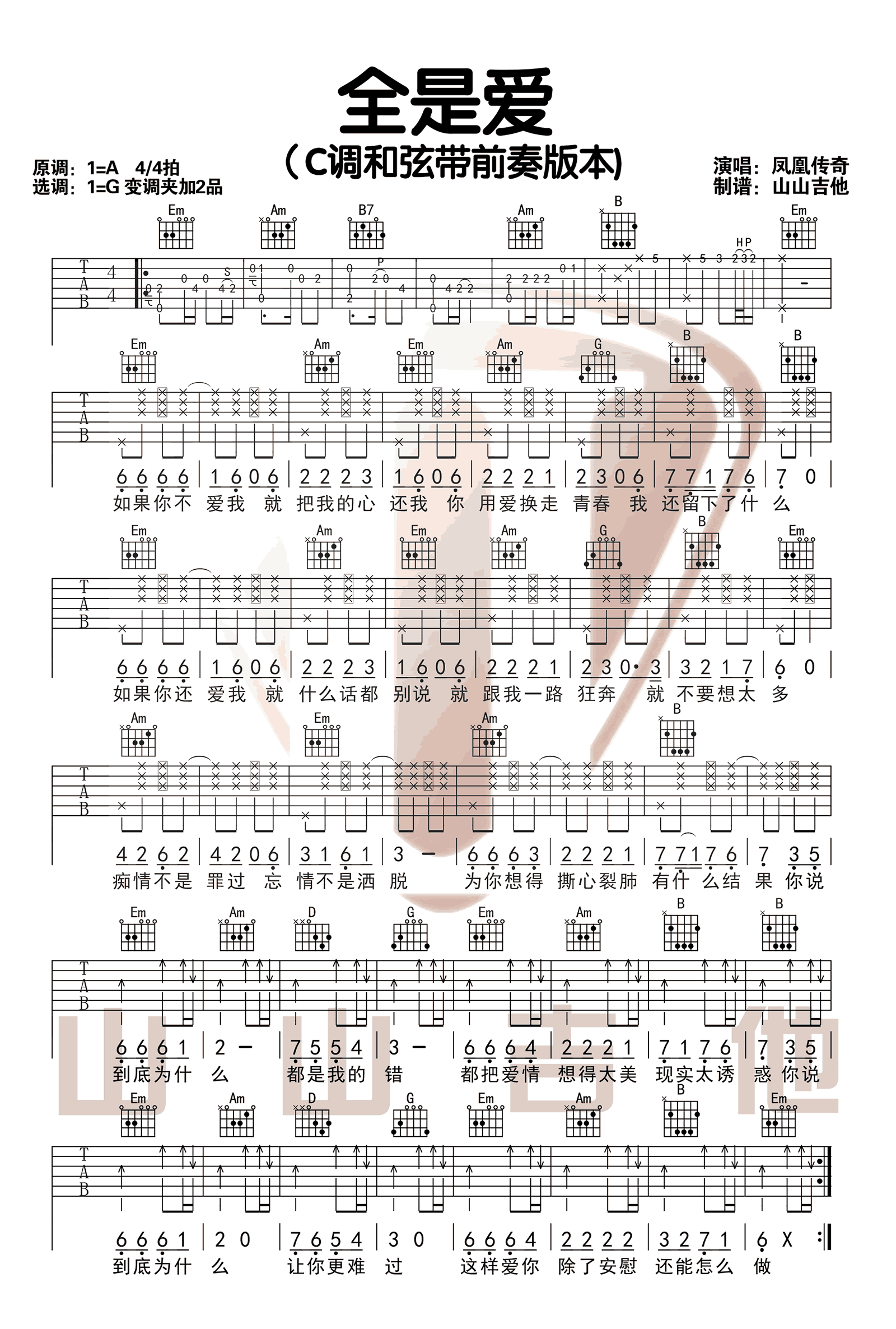 吉他凤凰传奇《全是爱》吉他谱_吉他弹唱谱_山山吉他编配