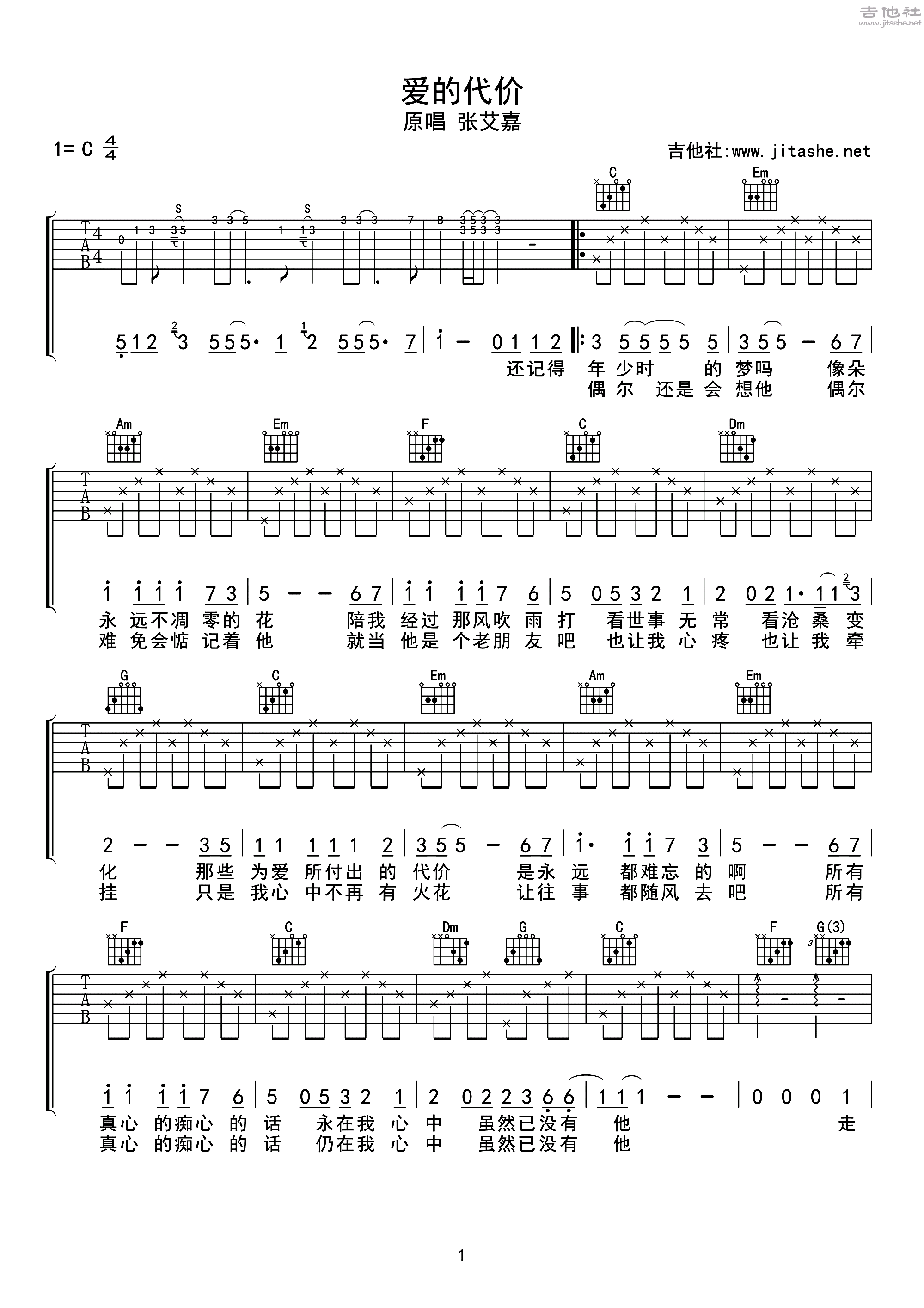 吉他张艾嘉《爱的代价》吉他谱_吉他弹唱谱