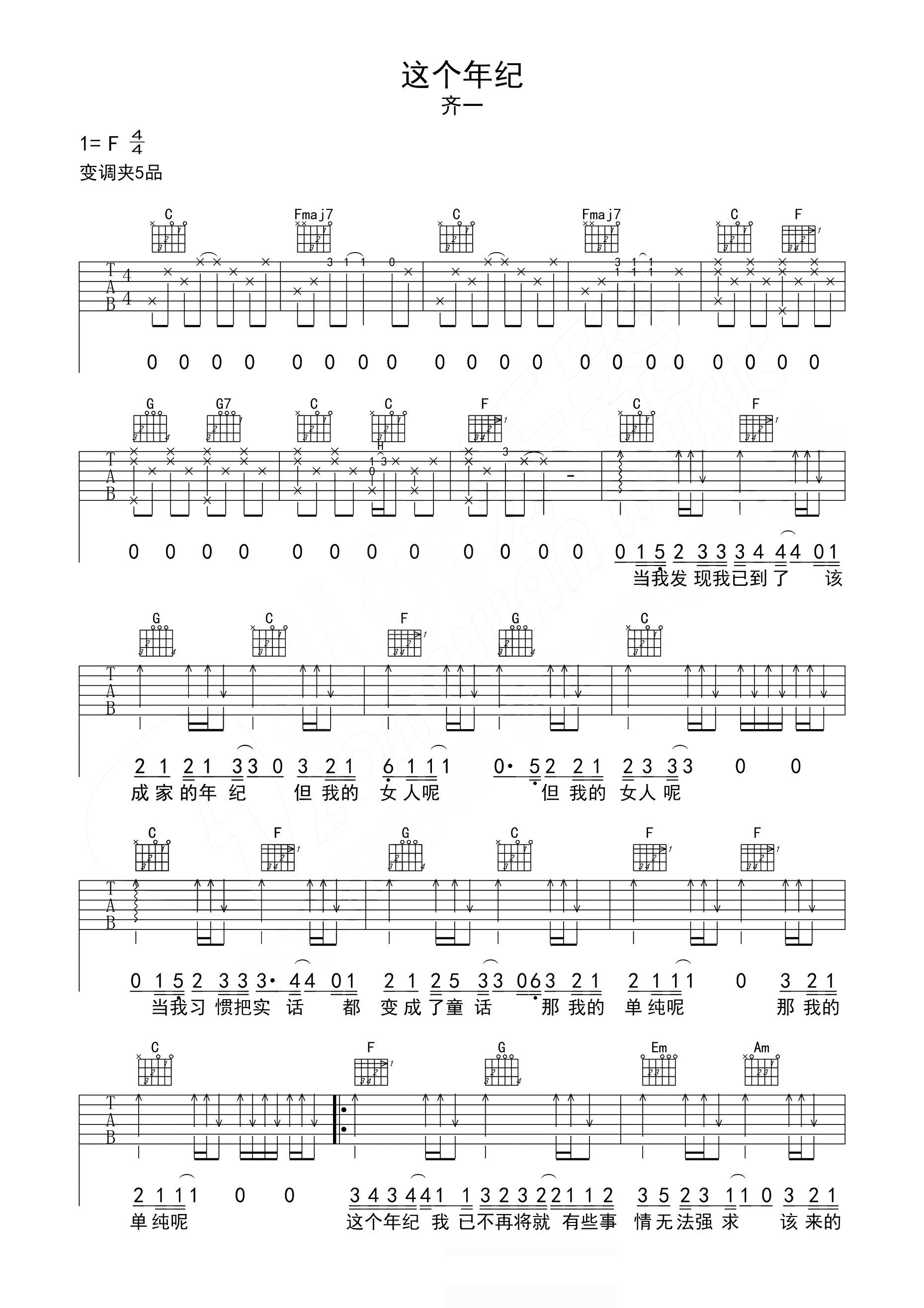 齐一《这个年纪》吉他谱,纵玩乐器编配出品,共有3张高清图谱。...