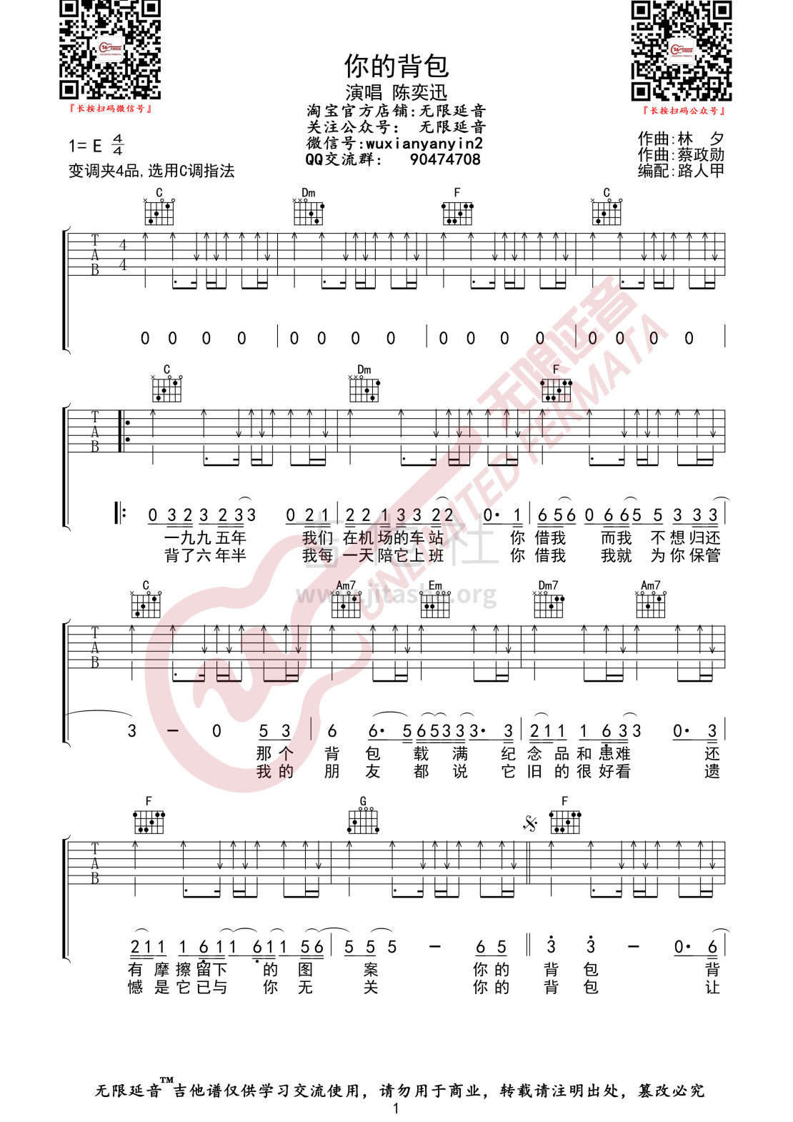 吉他陈奕迅《你的背包》吉他谱_吉他弹唱谱_无限延音编配